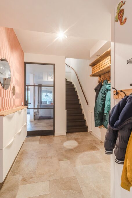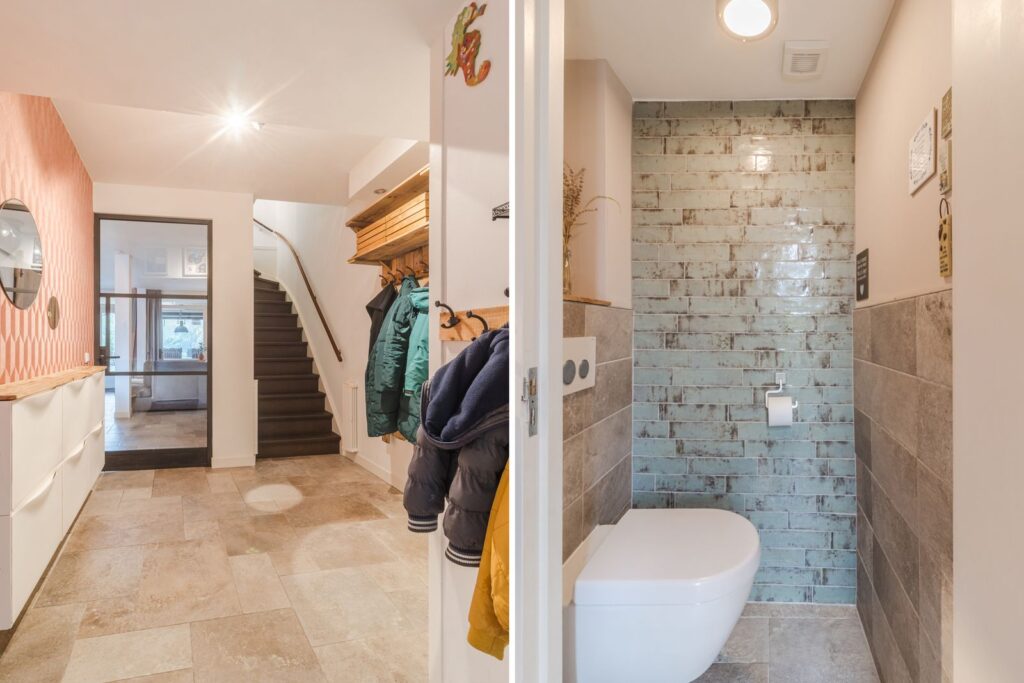 Via de entree kom je in de hal met toilet en trapopgang. Hier bevindt zich ook de deur naar de inpandige schuur.
