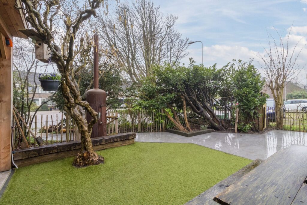 De royale hoektuin biedt veel privacy en ruimte om te genieten van het buitenleven. De zonnige achtertuin is gelegen op het westen. Onder de veranda is het heerlijk zitten. Hier is volop ruimte voor een gezellige zithoek en een buitenkeuken, waardoor het een perfecte plek is om lange zomeravonden door te brengen met familie en vrienden.