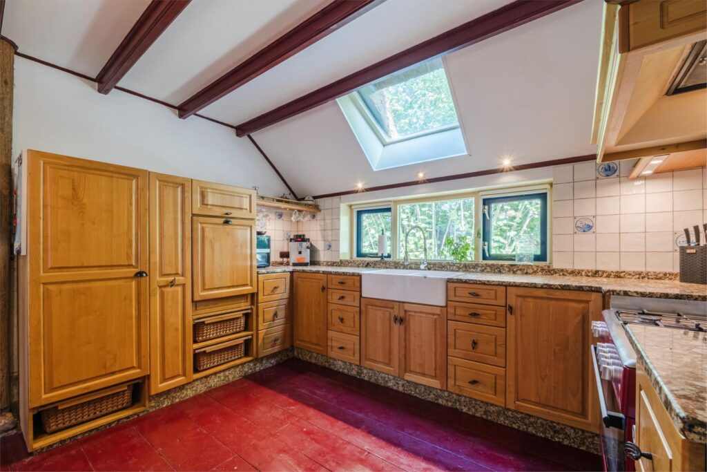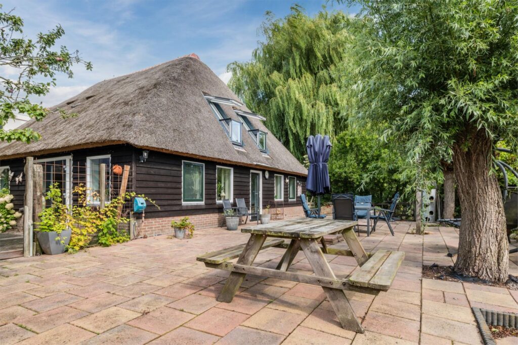Een royale, verbouwde woning met authentieke details zoals plafondbalken, zichtbare houten gebinten en een vernieuwd rieten dak.