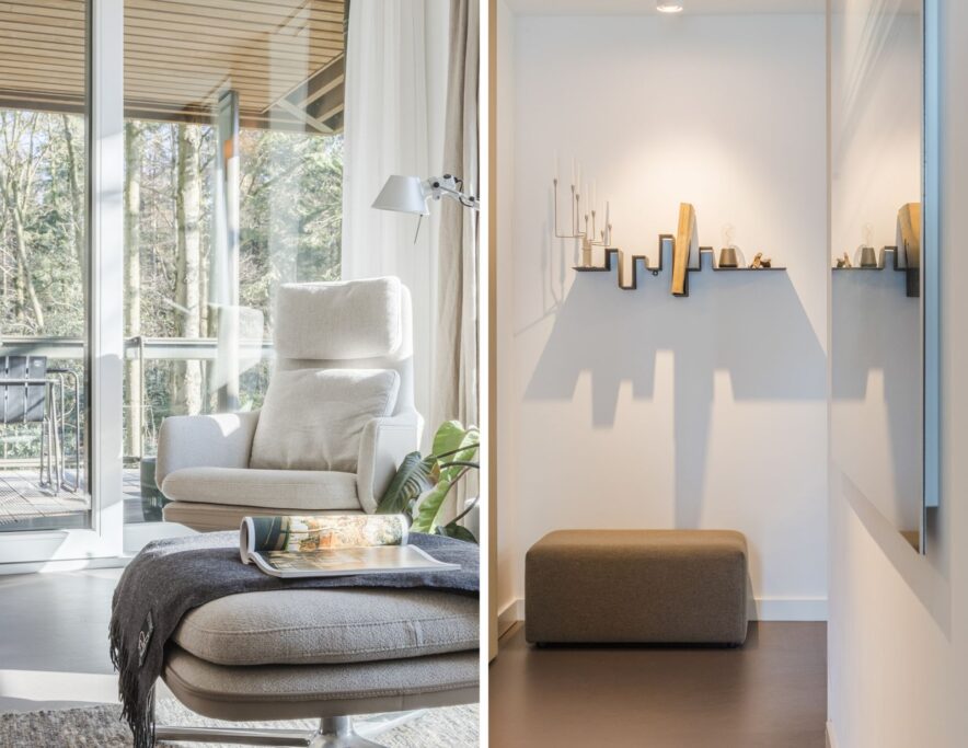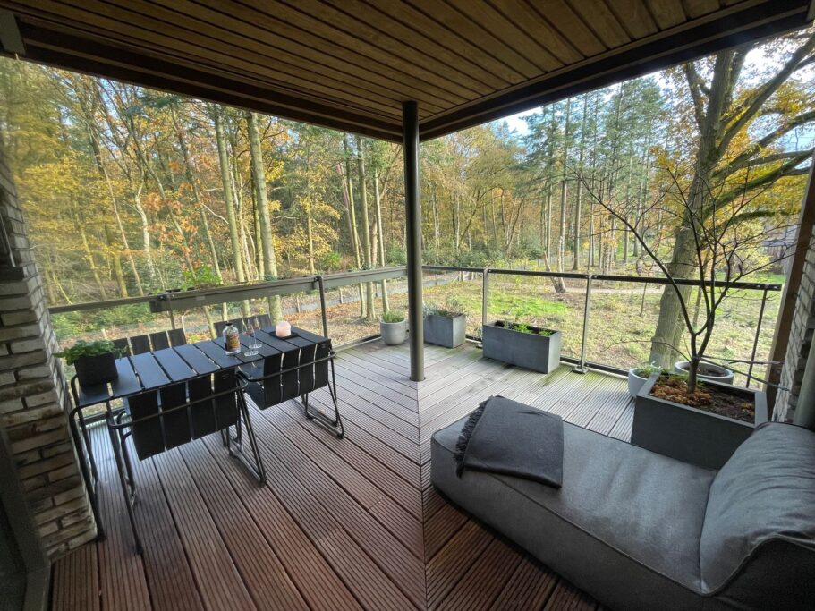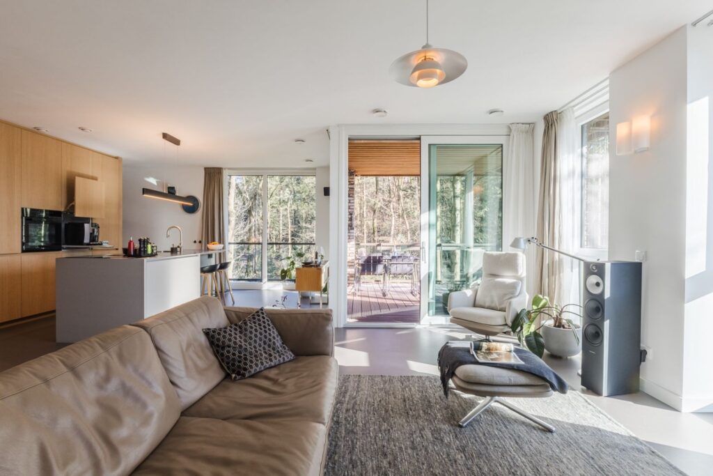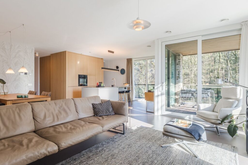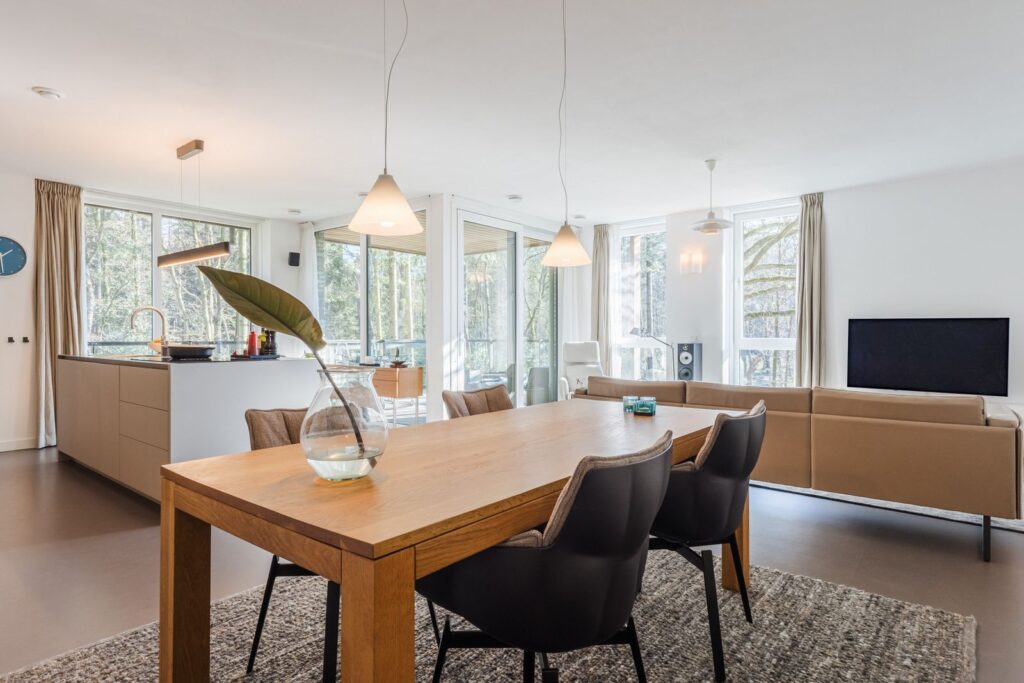 Grote raampartijen zorgen voor een zee aan licht en een panoramisch uitzicht op het bos. De rustgevende kleuren, natuurlijke materialen en grote ramen maken dit een bijzonder fijne leefruimte.Via de schuifpui bereik je het terras, waar je kan genieten van zon, stilte en natuur.