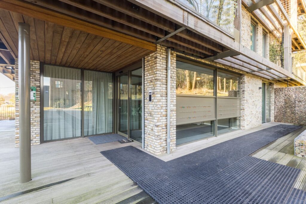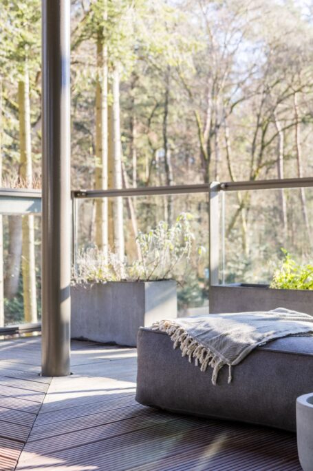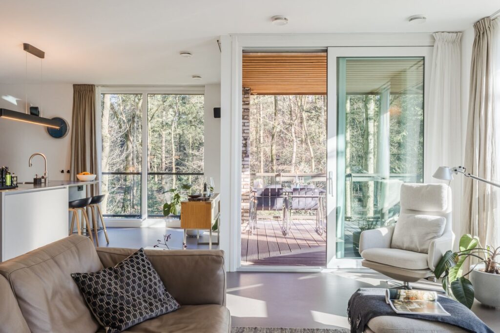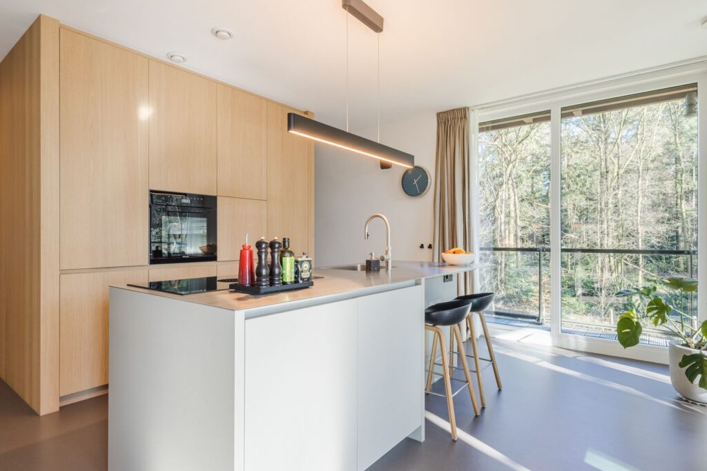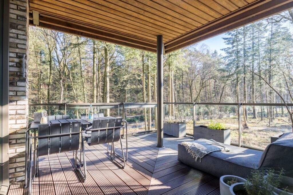 Grote raampartijen zorgen voor een zee aan licht en een panoramisch uitzicht op het bos. De rustgevende kleuren, natuurlijke materialen en grote ramen maken dit een bijzonder fijne leefruimte.Via de schuifpui bereik je het terras, waar je kan genieten van zon, stilte en natuur.