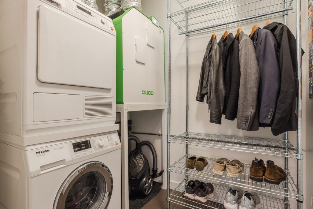 De hal geeft toegang tot het separate toilet en de ruime inpandige berging/wasruimte met WTW-installatie en aansluitingen voor wasmachine en droger.