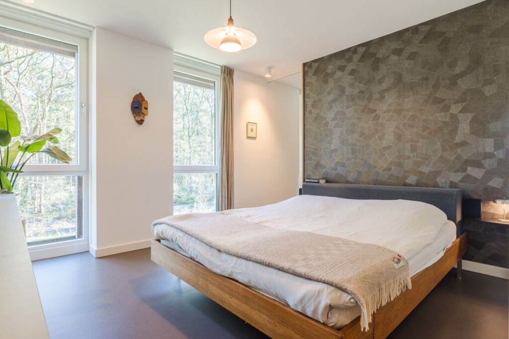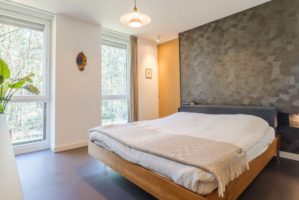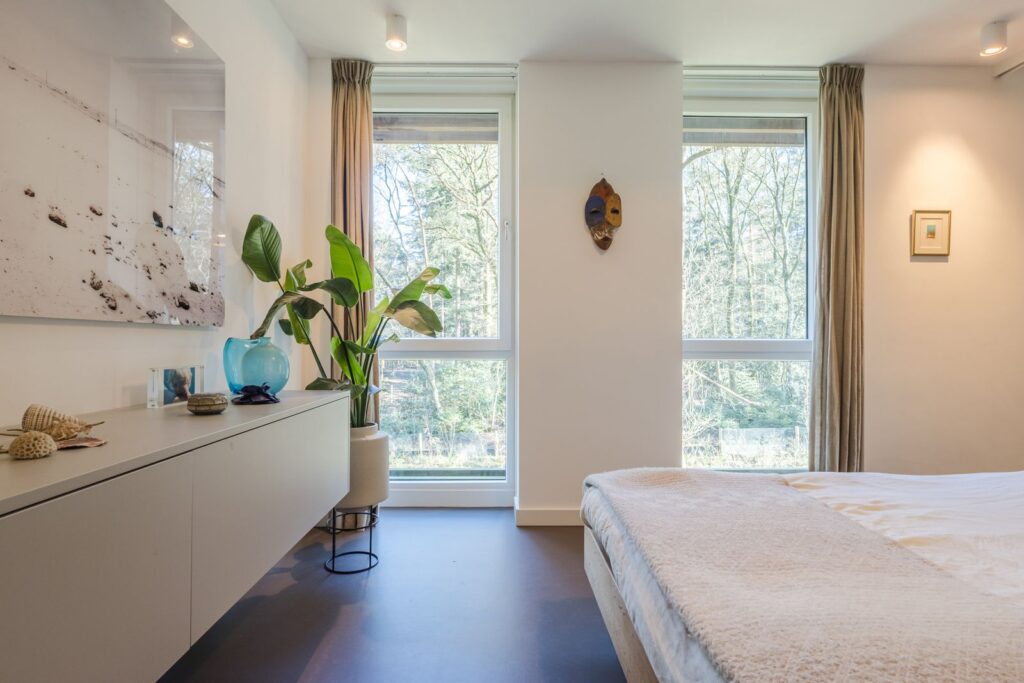 De master bedroom is via een grote houten taatsdeur bereikbaar en biedt een prachtig uitzicht op de bosrand.
