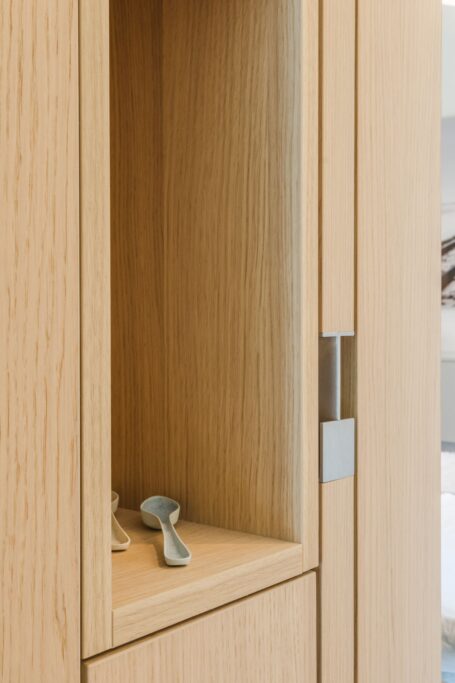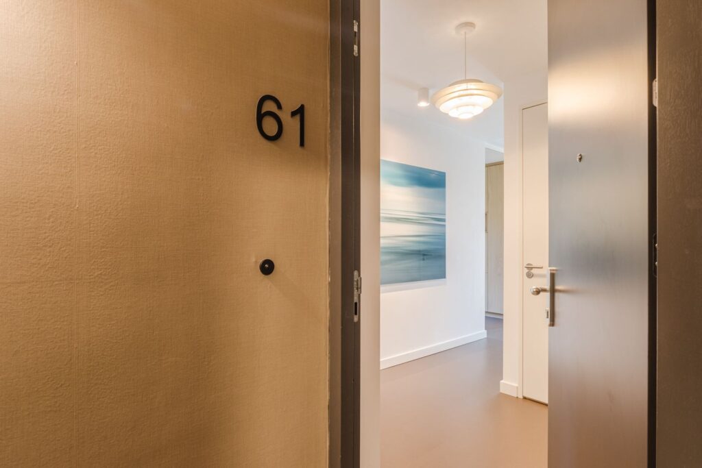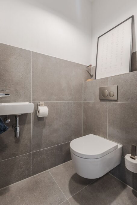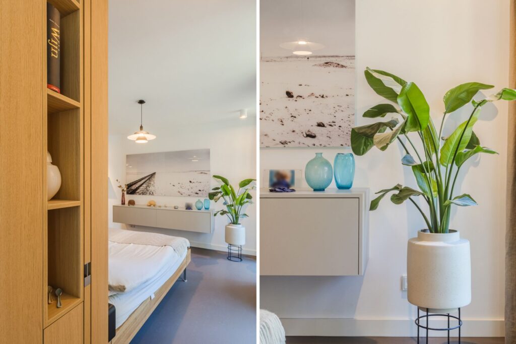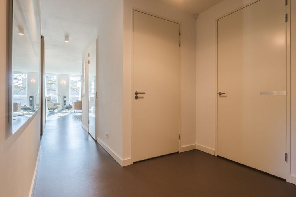 Bij binnenkomst vallen direct de luxe materialen en verfijnde afwerking op. De strak gestucte wanden en plafonds, de fraaie vloer en de houten taats- en schuifdeuren zorgen voor een rustige en luxe uitstraling.