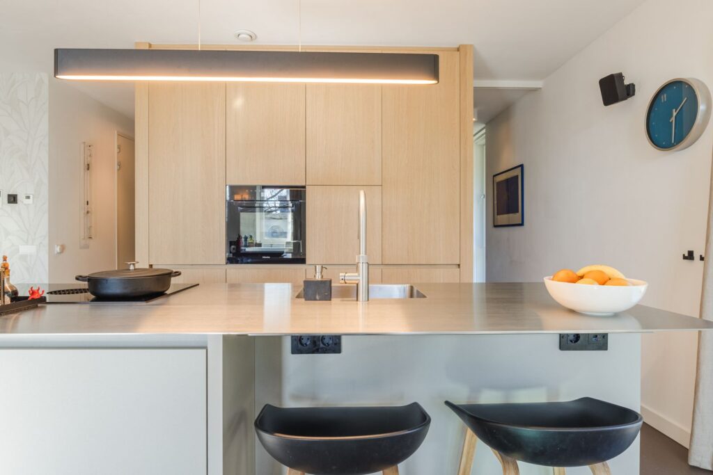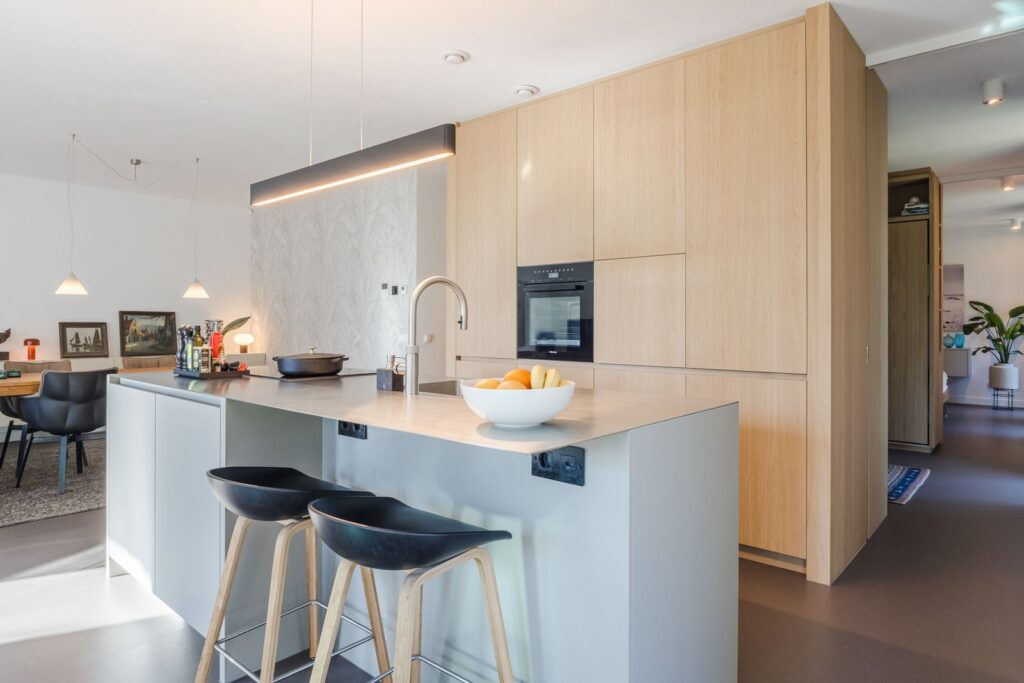 De open keuken is ontworpen door een interieurontwerper en is een echte eyecatcher. De combinatie van een kook-/spoeleiland en een hoge kastenwand in licht eikenhout maakt de keuken zowel praktisch als stijlvol.