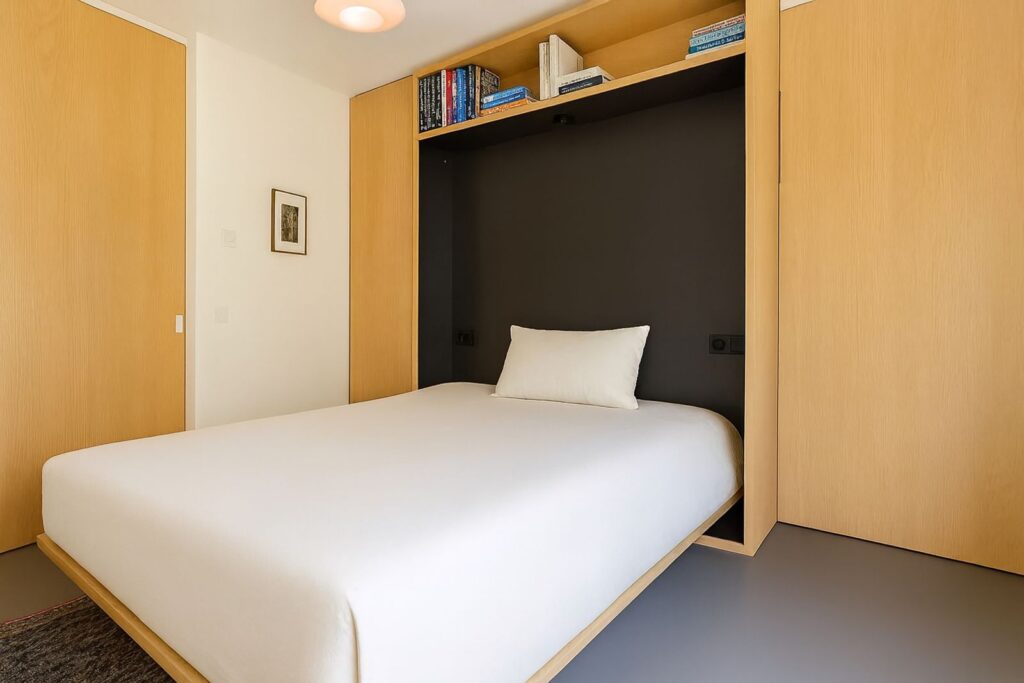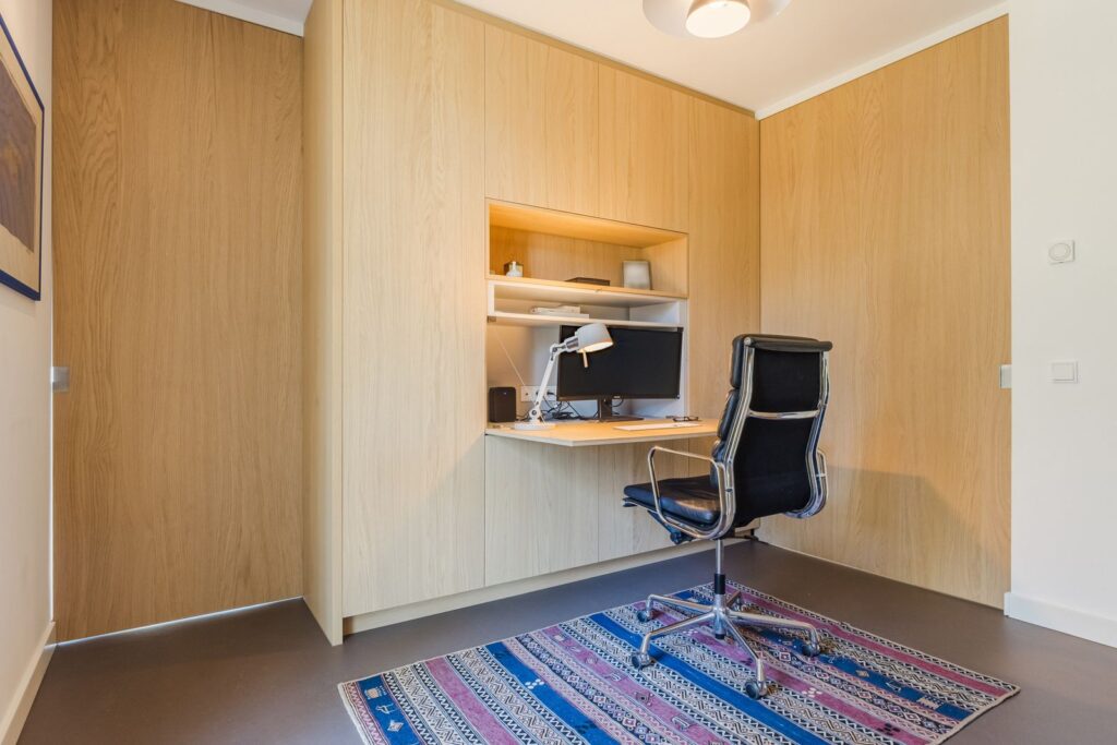De tweede slaapkamer is multifunctioneel door een op maat ingebouwd bureau en inklapbaar tweepersoonsbed. Deze kamer heeft meerdere grote inbouwkasten. Perfect als logeerkamer, werkkamer, hobbyruimte of ruime walk-in closet.