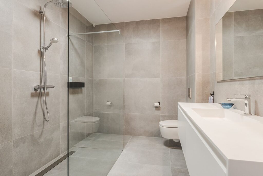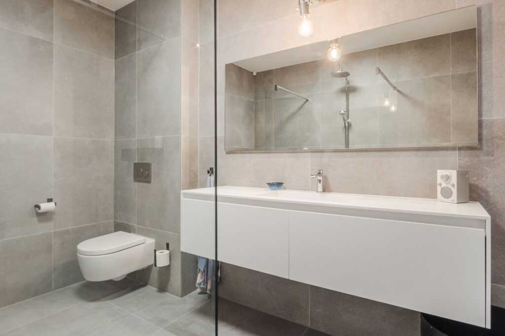 De moderne badkamer is met grote tegels afgewerkt en voorzien van: