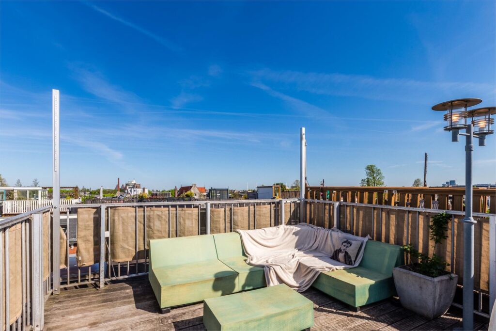 Van hieruit is er een houten trap naar het dakterras dat 24m² beslaat en een prachtig uitzicht over de stad biedt. Een ideale plek om te ontspannen of te genieten van het buitenleven; het terras is voorzien van een waterpunt, elektriciteit en verlichting.