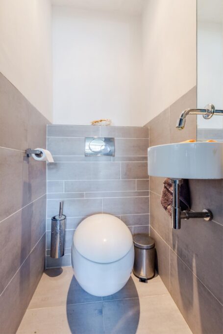 Tussen de slaapkamers bevindt zich de moderne badkamer met 2 separate wastafels en aparte kastjes. Verder is hier ruimte voor de wasmachine en droger.