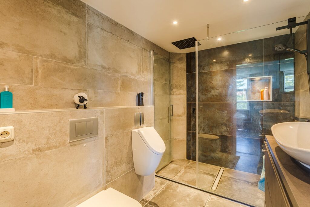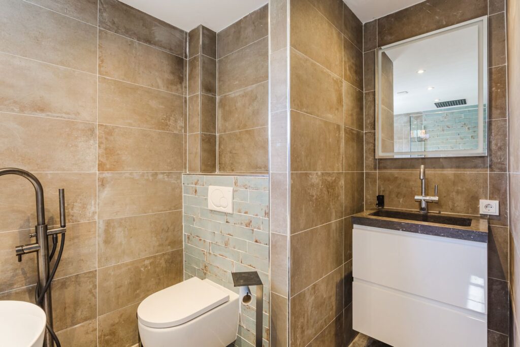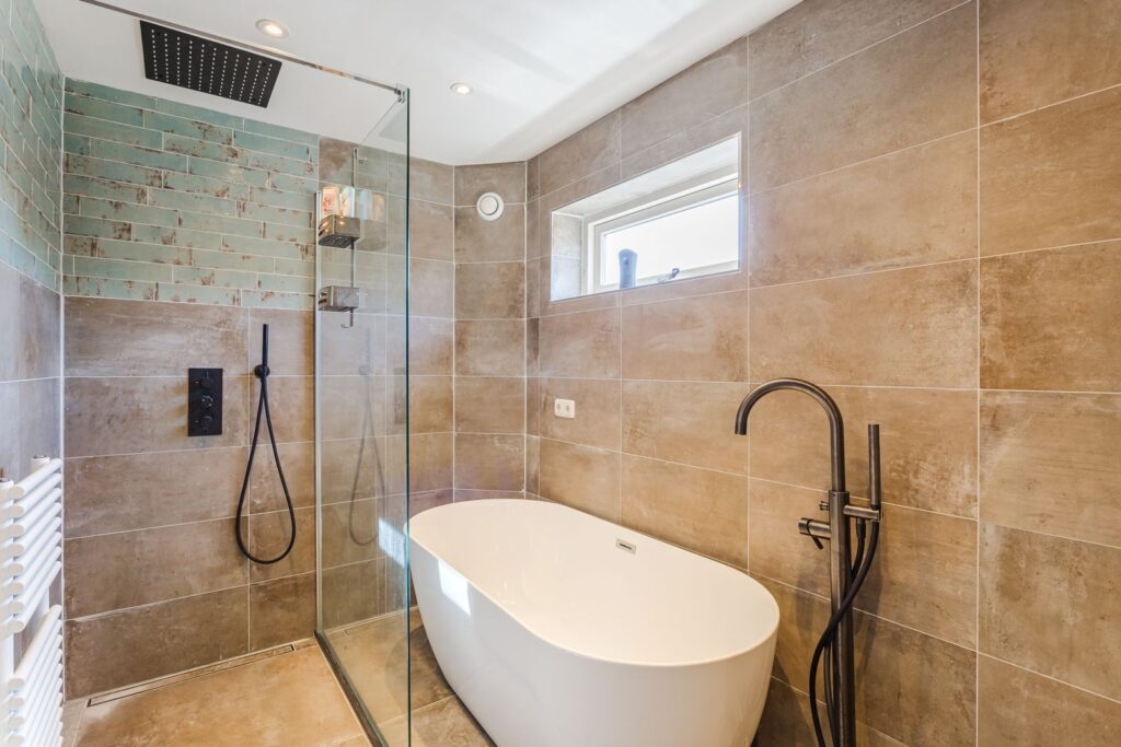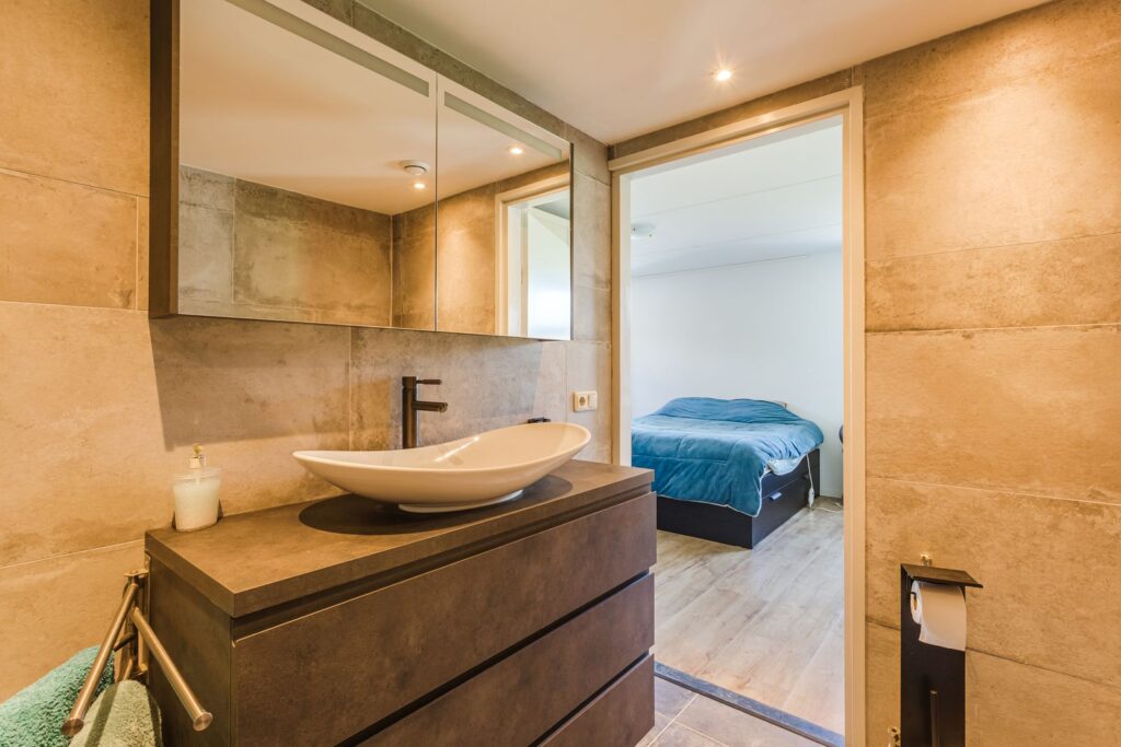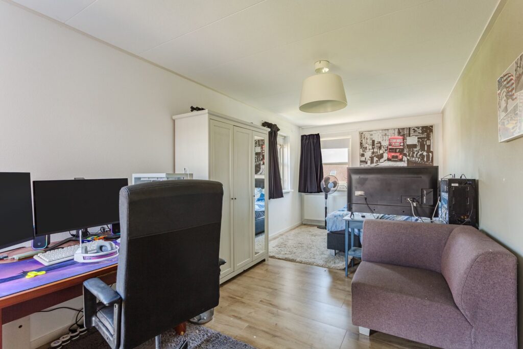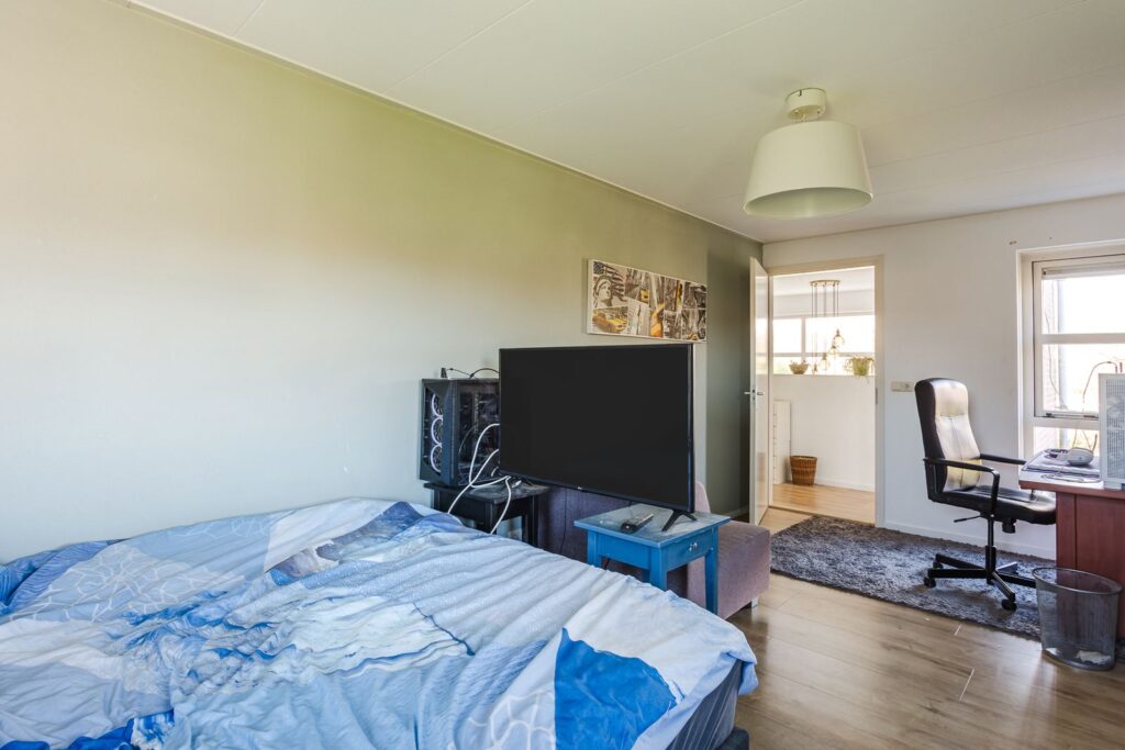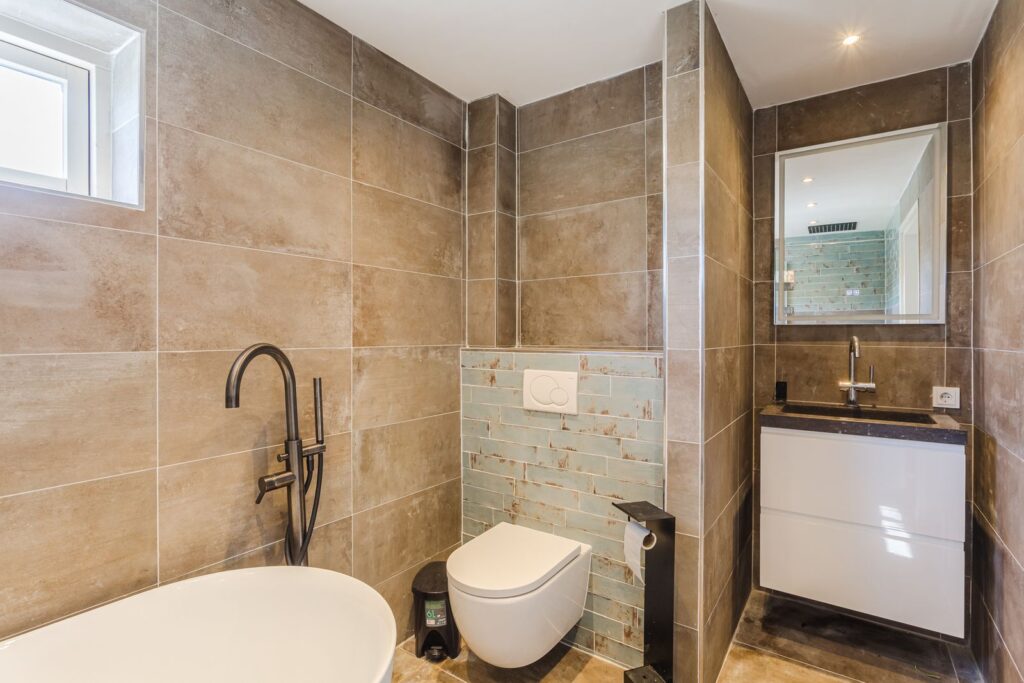 Op de eerste verdieping bevinden zich twee slaapkamers, waarbij de grootste kamer eenvoudig kan worden opgesplitst in twee aparte kamers. Daarnaast is er een moderne badkamer aanwezig met ligbad, stortdouche, toilet en wastafel.