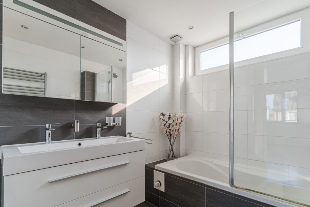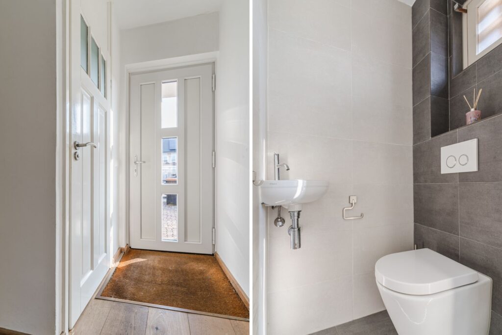 Overloop, drie slaapkamers, aan de achterzijde twee slaapkamers en aan de voorzijde de 3e slaapkamer, met rechte wanden over de gehele eerste verdieping. De drie slaapkamers en de hal zijn voorzien van laminaatvloer. Een moderne badkamer met ligbad en dubbele wastafel en tweede hangend toilet, designradiator en vloerverwarming.