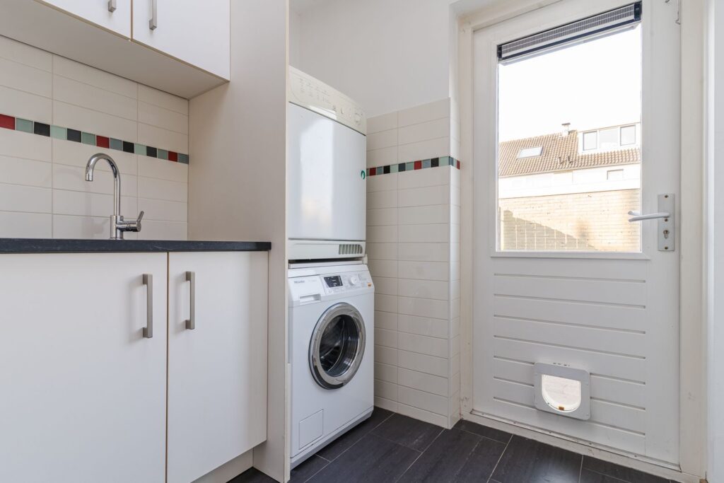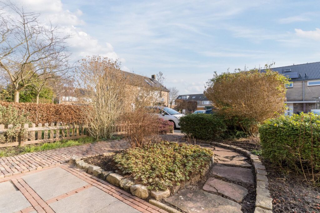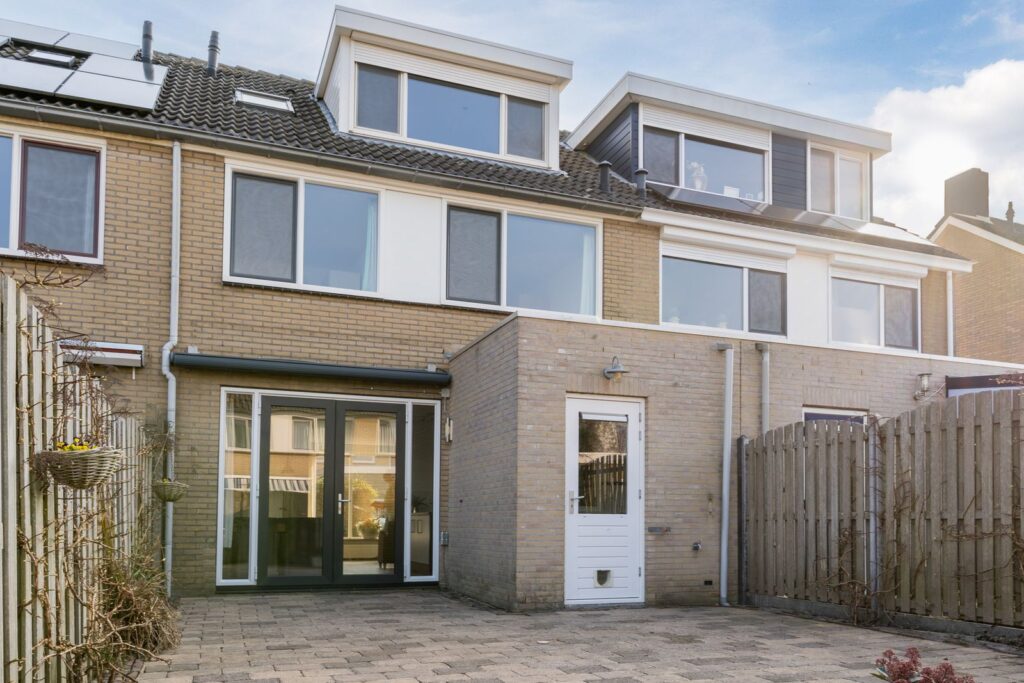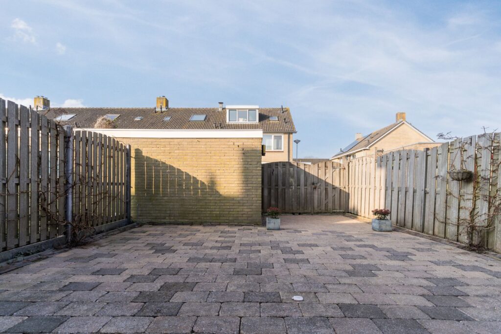 Achtertuin ligt op het westen en is geheel bestraat. Hier geniet je het grootste gedeelte van de dag, tot in de avonduren, van de zon. Tegen de zon is er een zonwering die elektrisch wordt aangedreven. Daarnaast beschikt de tuin over een stenen berging voor fietsen en tuinspullen en is er een achterom naar de steeg achter de woning.