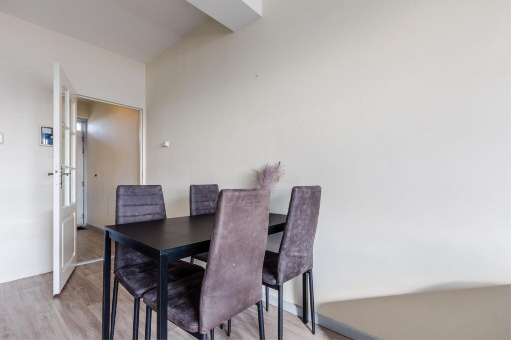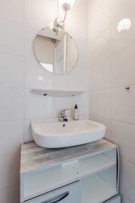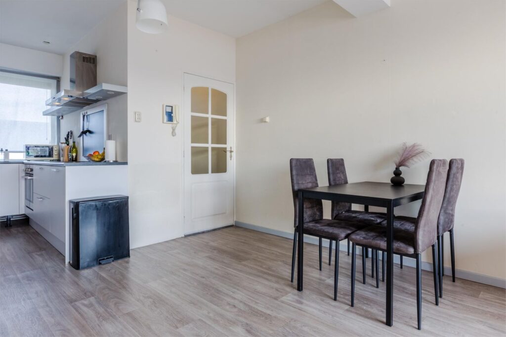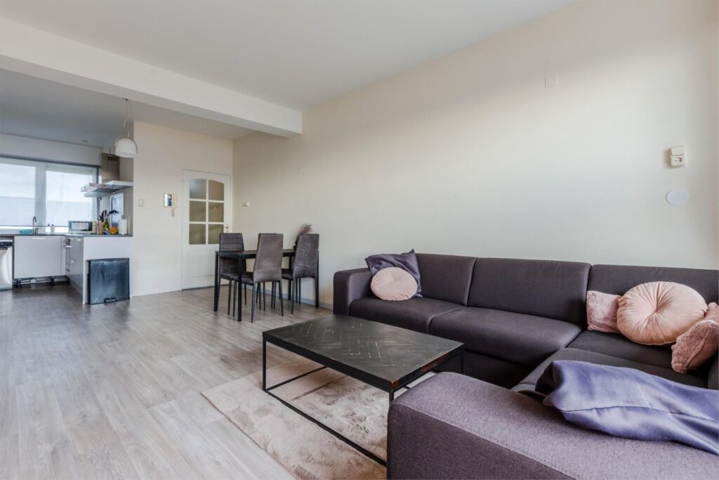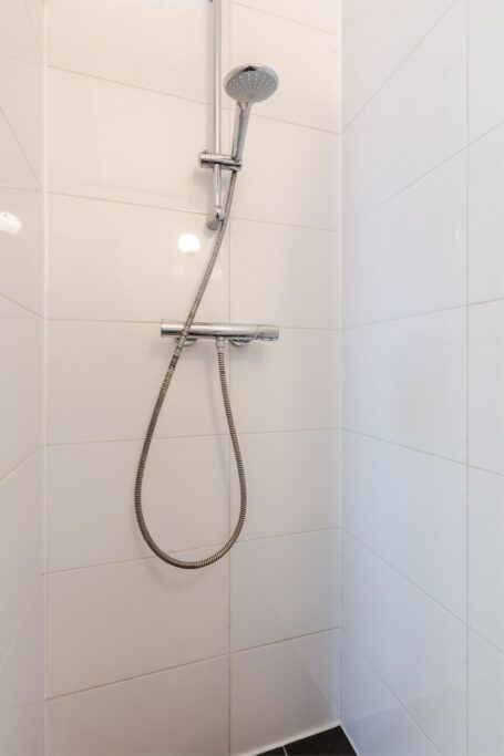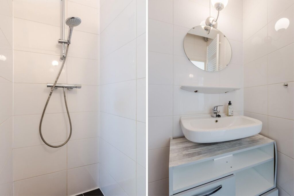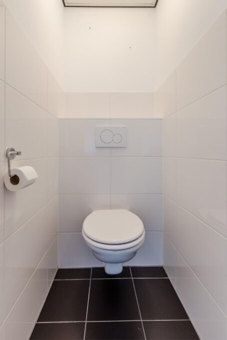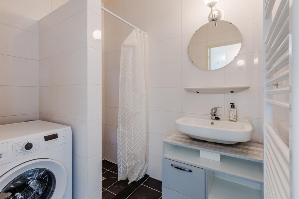Via de woonkamer naar de achterste slaapkamers bereik je ook de badkamer. De ruimte is volledig betegeld met zwarte tegels op de vloer en witte tegels op de wand. Het geheel is netjes afgewerkt en leent zich uitstekend om na een hectische dag even lekker tot rust te komen. Je beschikt over een inloopdouche en een wastafel. Tevens bevinden zich hier ook de witgoedaansluitingen.