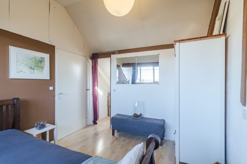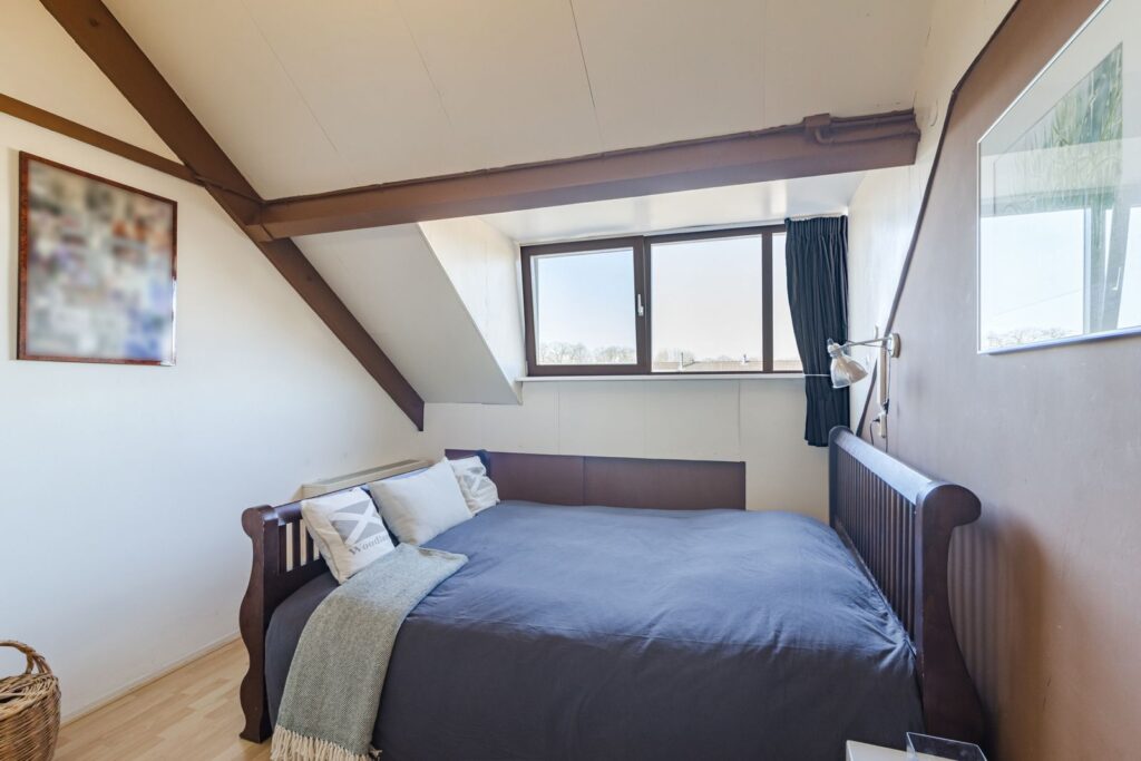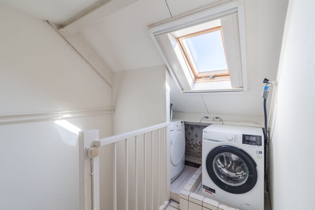 Vierde slaapkamer met veel lichtinval door de dakkapel en voorzien van laminaatvloer, hobby ruimte, aparte bergruimte en bergruimte achter knieschotten, unit van de mechanische ventilatie en aansluitingen voor de wasmachine en de droger.