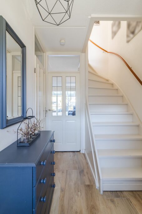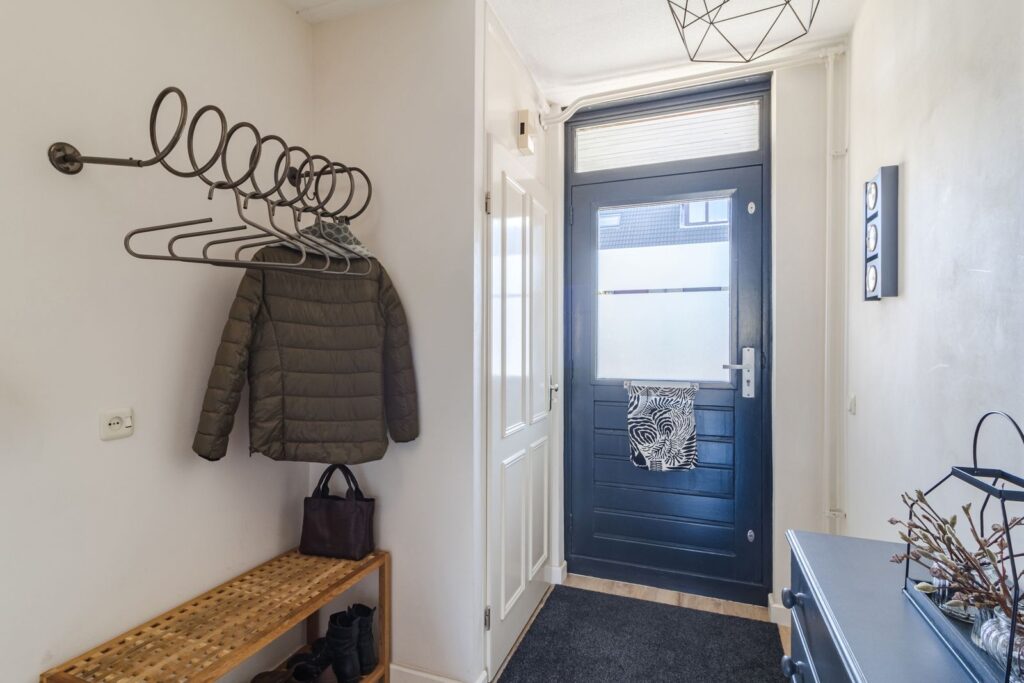 Woningentree; hal met garderobe, meterkast, toilet en trapopgang.