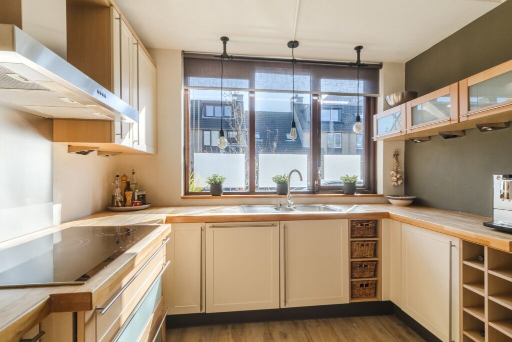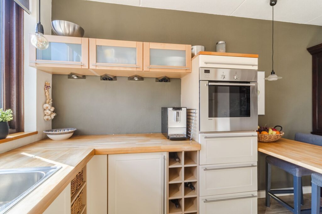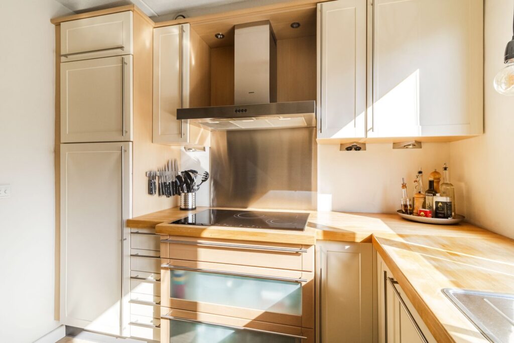 Open keuken voorzien van diverse apparatuur: kookplaat, afzuigkap, heteluchtoven, koelkast en vaatwasmachine.