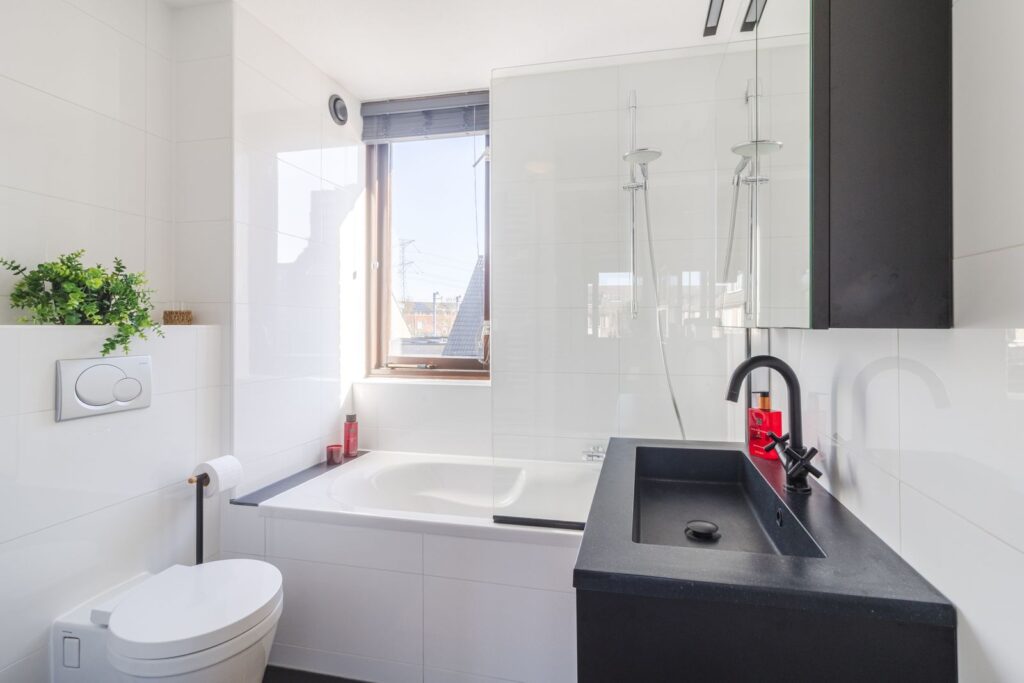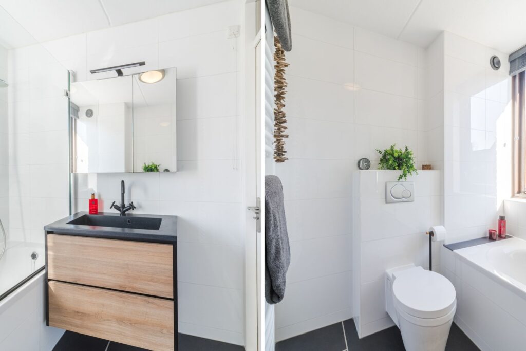 Badkamer met ligbad met douchegedeelte, badkamermeubel, 2e wandtoilet en een raam voor het benodigde licht en ventilatie.