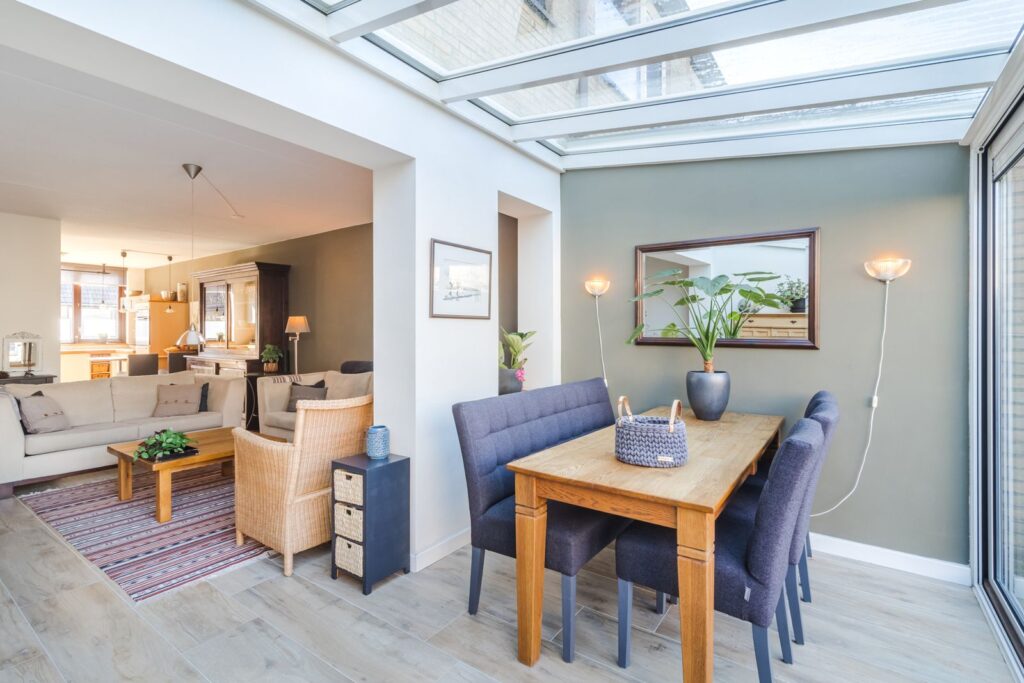 Woonkamer voorzien van plavuizen met vloerverwarming, open verbinding met de keukenruimte en de serre die veel lichtinval biedt door de grote raampartijen en uitzicht op de tuin.