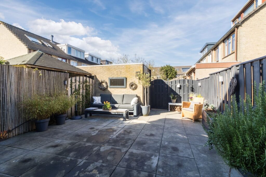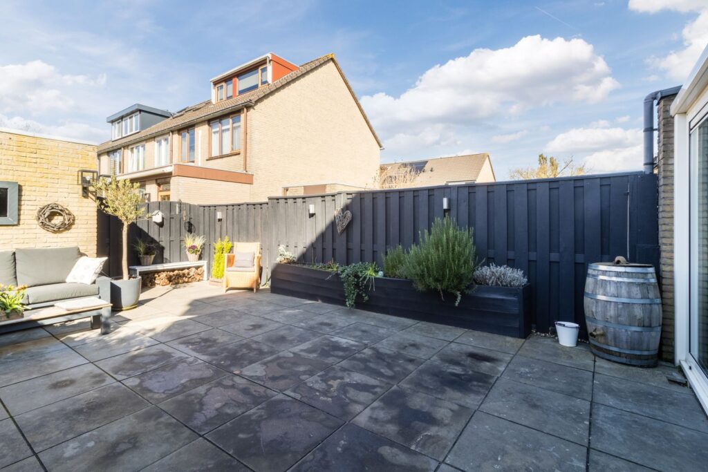 De tuin is onderhoudsvriendelijk aangelegd en biedt voldoende ruimte om te ontspannen en te genieten van de zon.