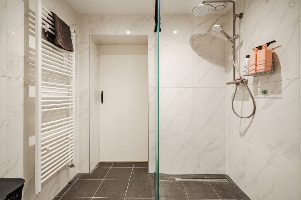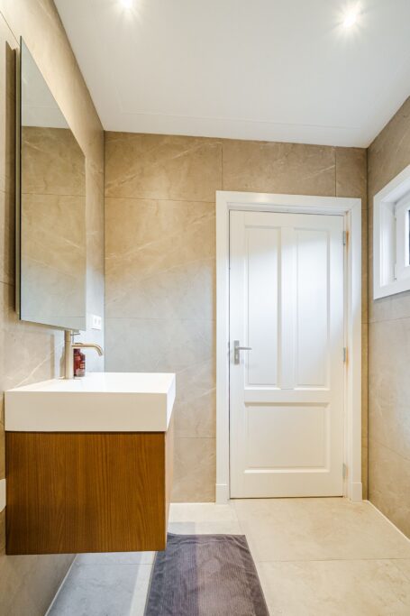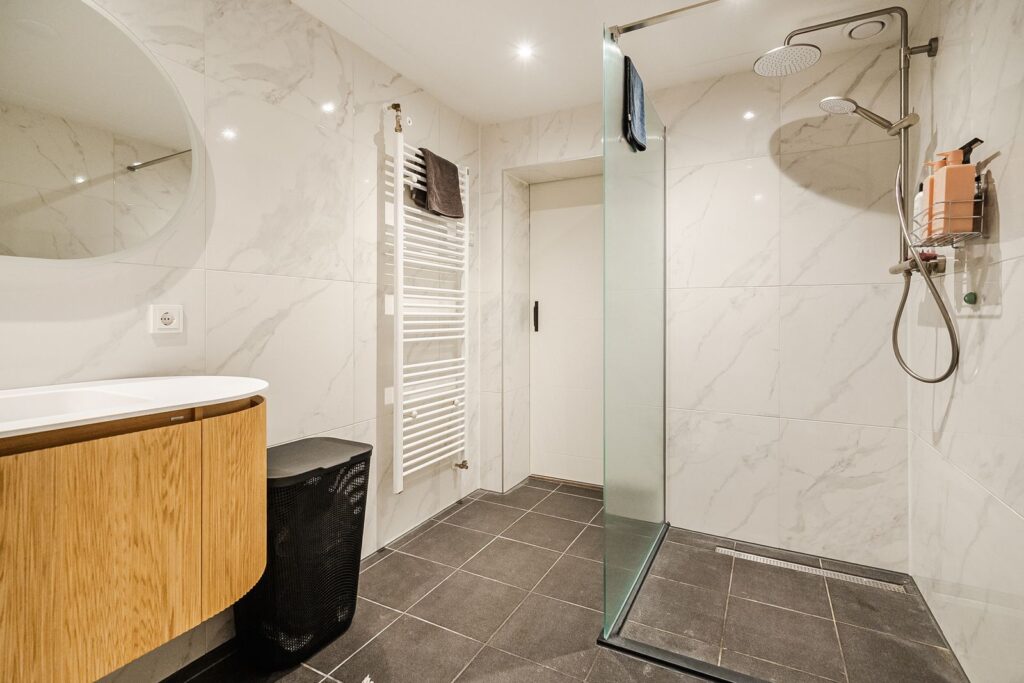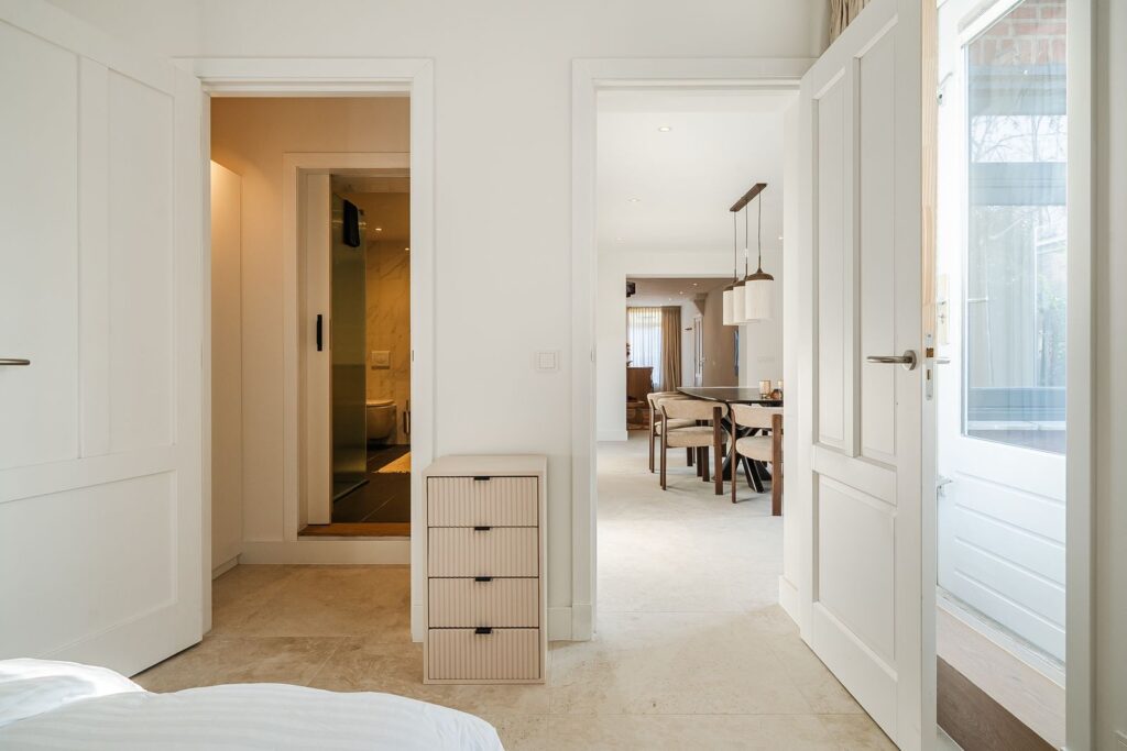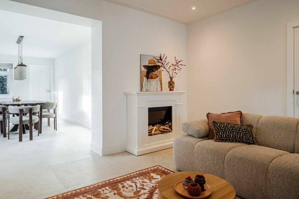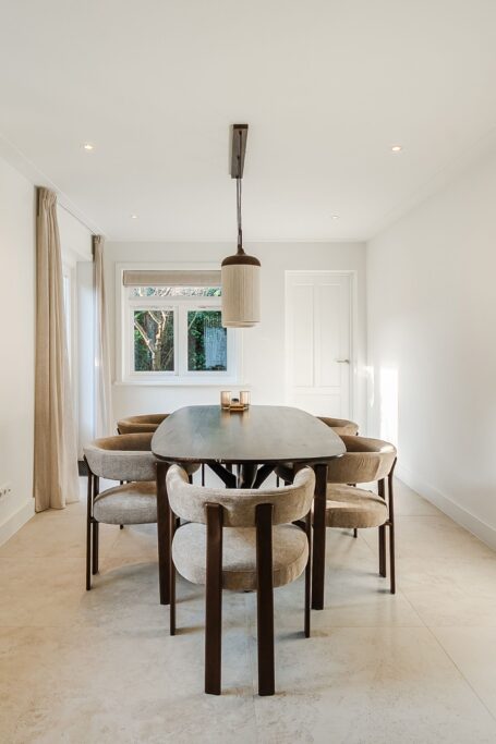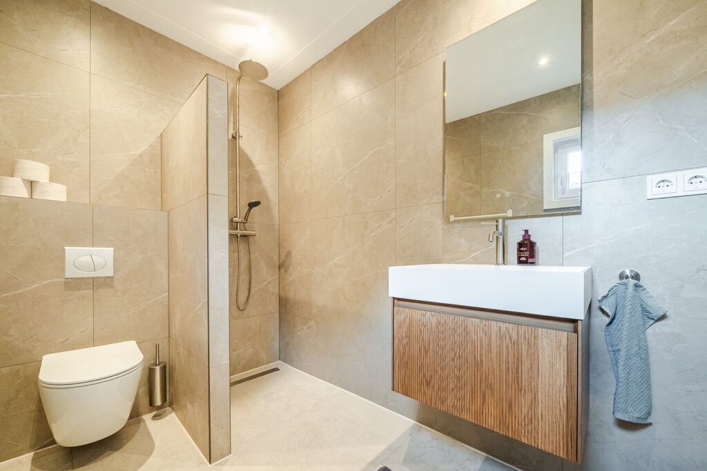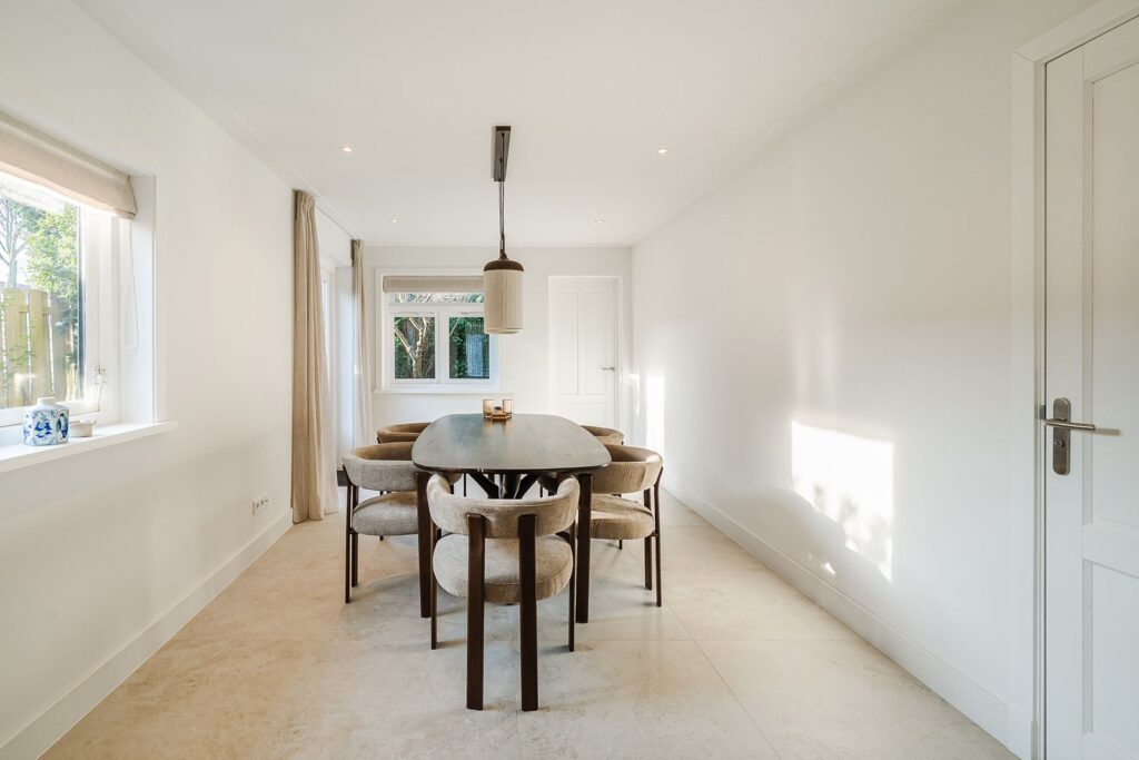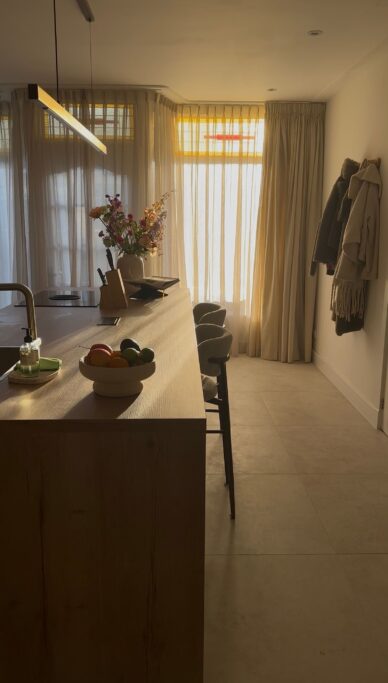 De woning is volledig afgewerkt met een hoogwaardige keramische Travertine-look tegelvloer. Deze vloer is onderhoudsvriendelijk, geleidt de warmte van de vloerverwarming uitstekend en zorgt voor een luxe, rustige uitstraling. Door de mooie lichtinval komt het karakter van de tegel extra tot leven en krijgt de ruimte een stijlvolle, warme sfeer.