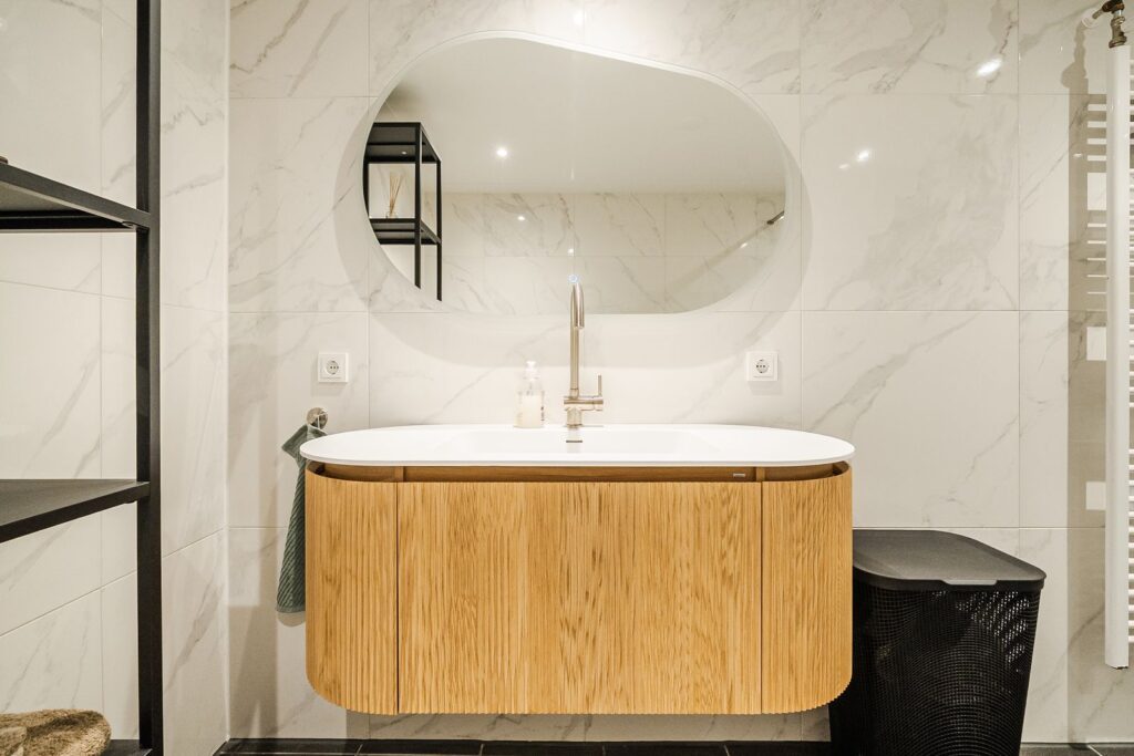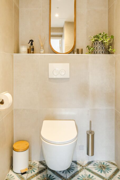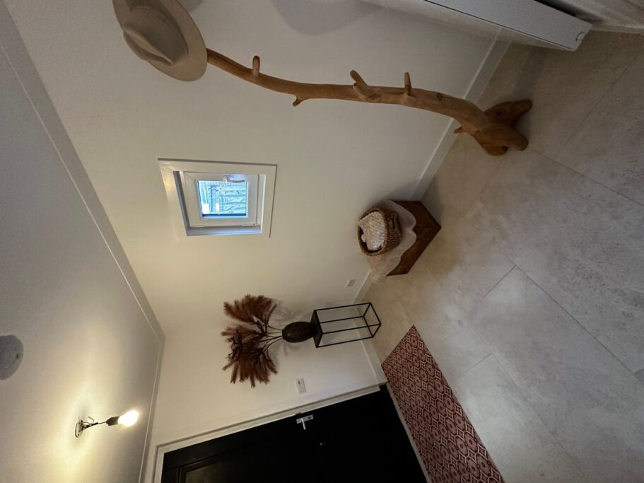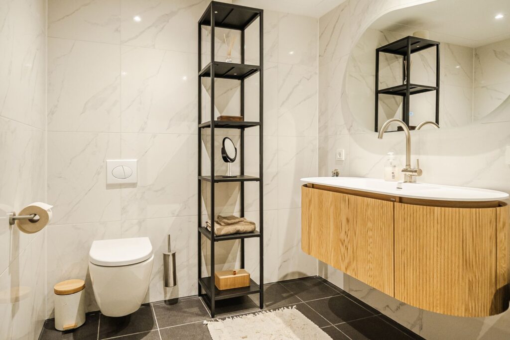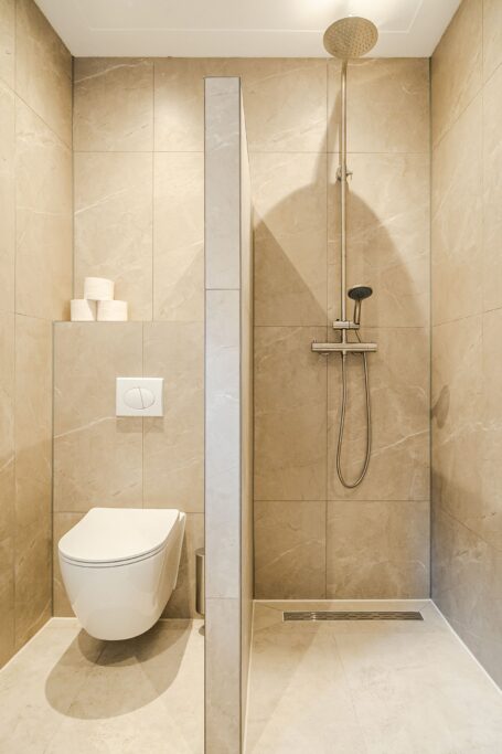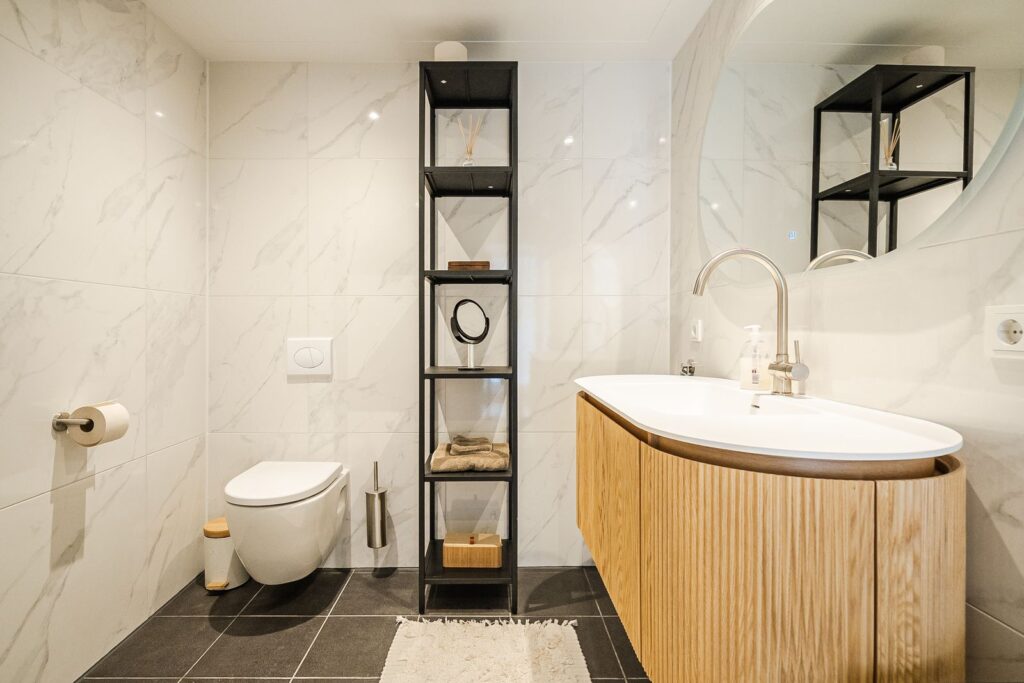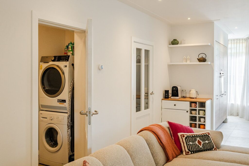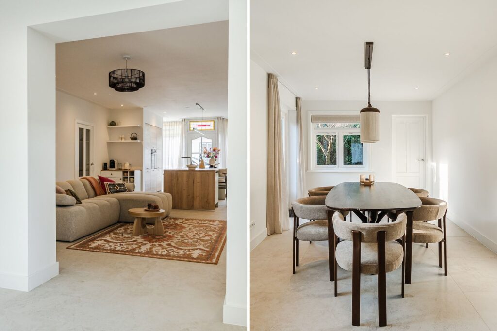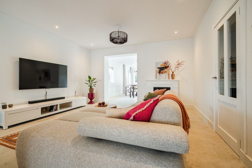 De woning is volledig afgewerkt met een hoogwaardige keramische Travertine-look tegelvloer. Deze vloer is onderhoudsvriendelijk, geleidt de warmte van de vloerverwarming uitstekend en zorgt voor een luxe, rustige uitstraling. Door de mooie lichtinval komt het karakter van de tegel extra tot leven en krijgt de ruimte een stijlvolle, warme sfeer.