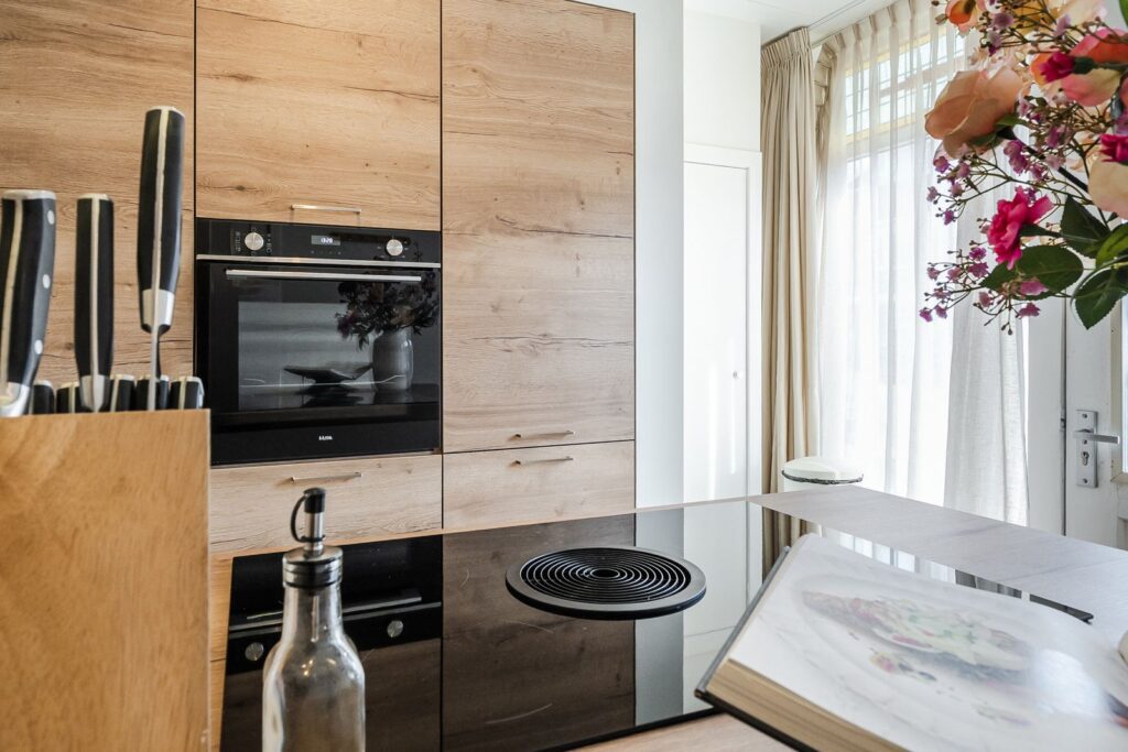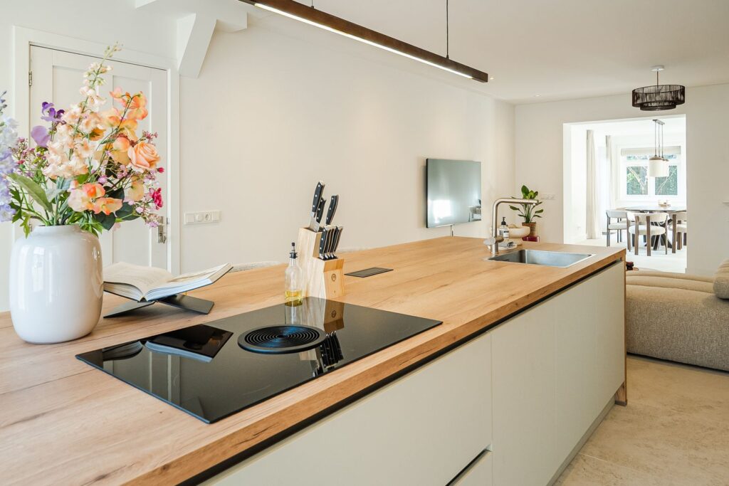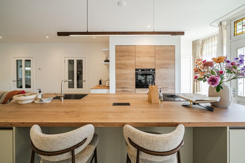 Absolute blikvanger het designer kookeiland van ruim 3.6 m² van Janssen en Ko, uitgevoerd met geïntegreerde kookplaatafzuiging. Door de royale loopruimte aan beide kun je uitgebreid koken met alle ruimte die je nodig hebt, terwijl je gasten tegenover je zitten aan de bar.