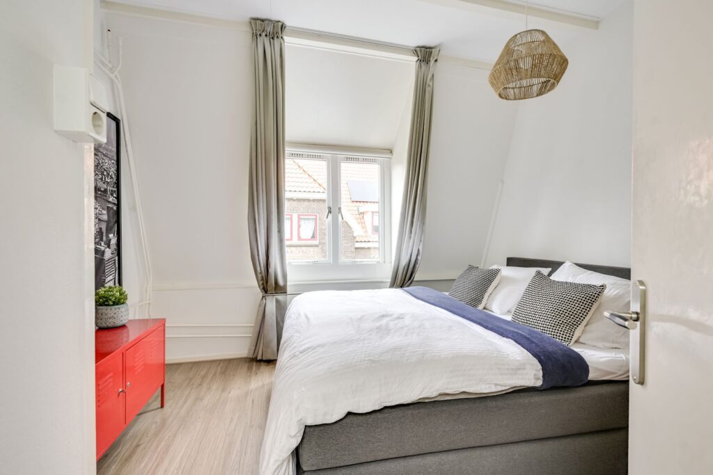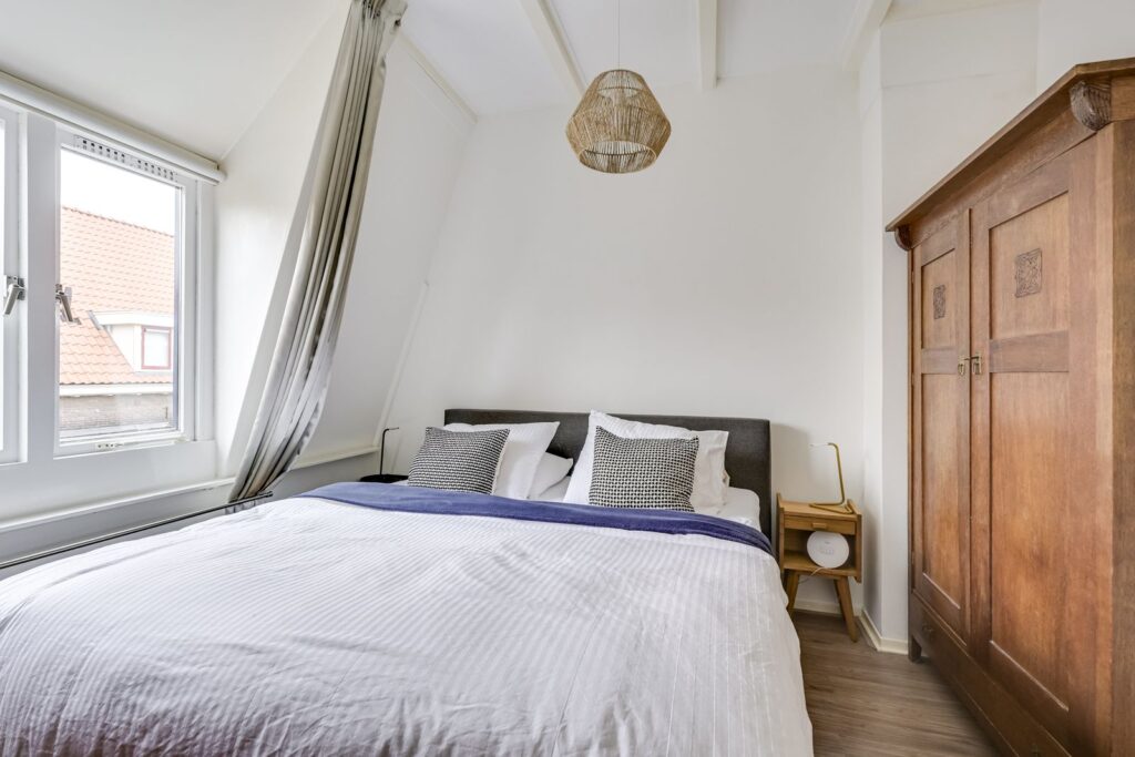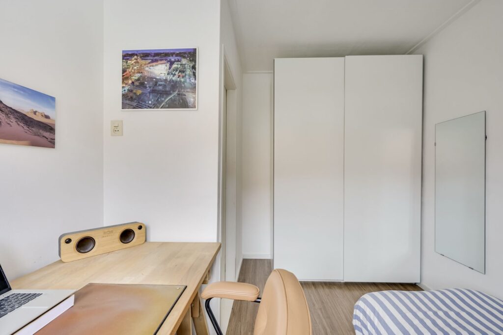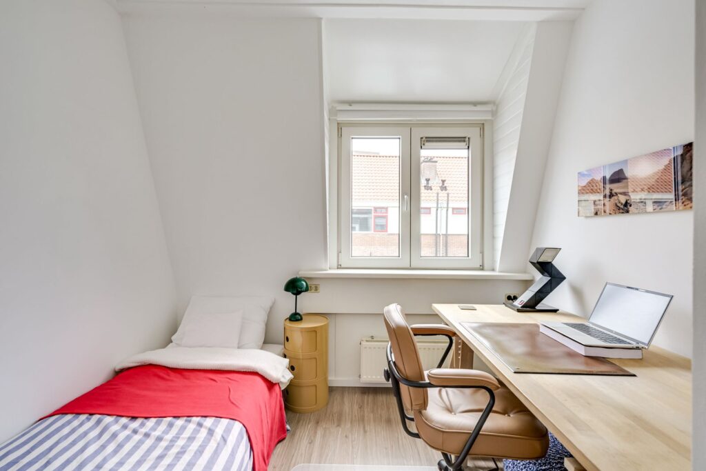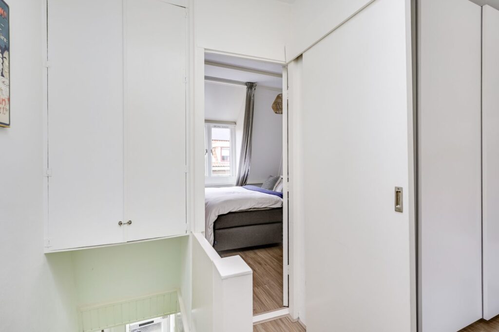 De overloop geeft toegang tot twee slaapkamers. De hoofdslaapkamer is ruim en biedt voldoende plek voor een tweepersoonsbed en een grote kast. De tweede kamer aan de voorzijde is momenteel ingericht als werk- en logeerkamer en laat zien hoe multifunctioneel deze ruimte is. Er past met gemak een bureau én een bed. Dankzij het raam en de schuine kap voelt ook deze kamer licht en prettig aan – ideaal voor thuiswerken of als tweede slaapkamer.