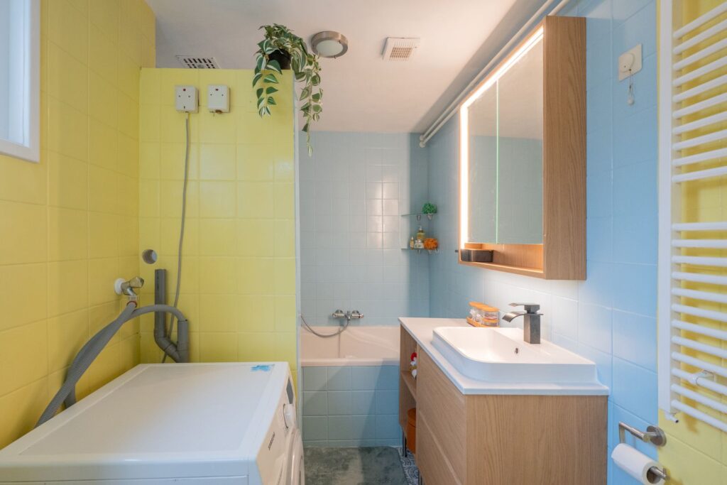 Through the intermediate hallway, you reach the bathroom. It is surprisingly complete and features a bathtub with shower, modern washbasin unit with illuminated mirror cabinet, toilet, and washing machine connection.