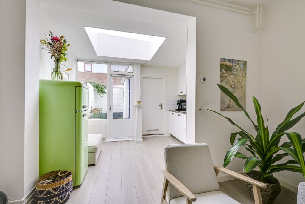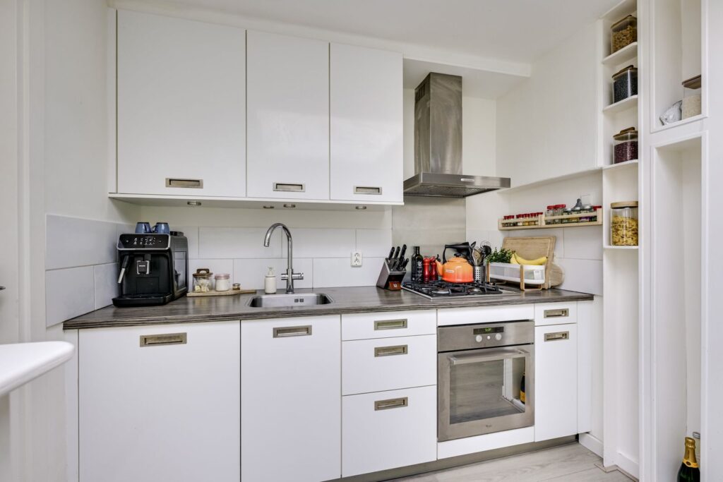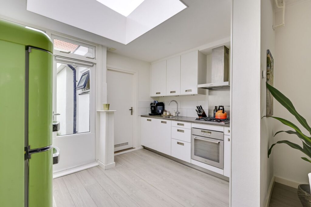 Aan de achterzijde bevindt zich de keuken. Dankzij de lichtkoepel en de deur naar de tuin is dit een fijne, lichte ruimte. De keuken is voorzien van een gaskookplaat met afzuigkap, oven, vaatwasser en volop kastruimte. Compact, maar praktisch ingericht – met plek voor je koffiecorner en kookspullen.