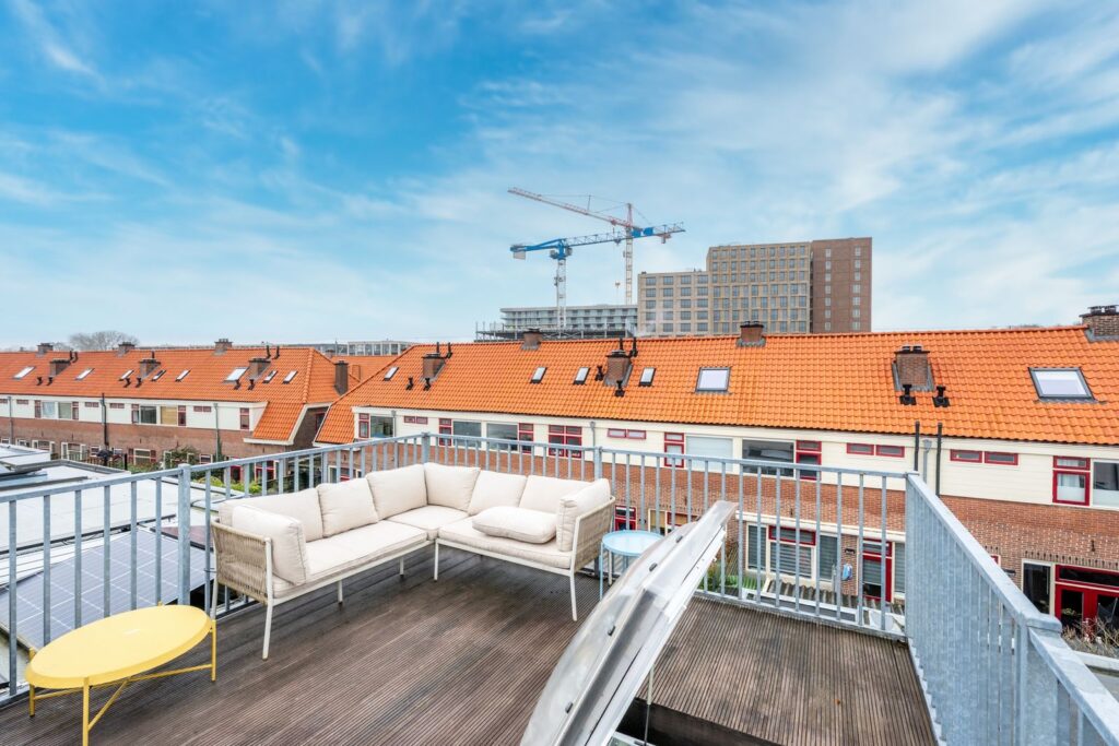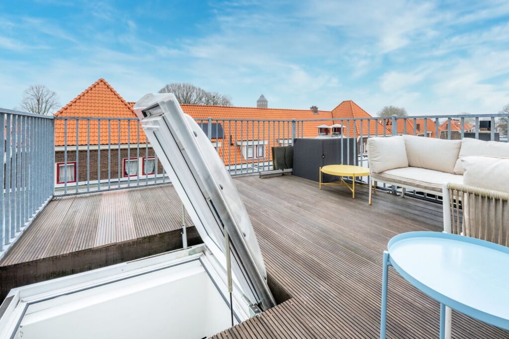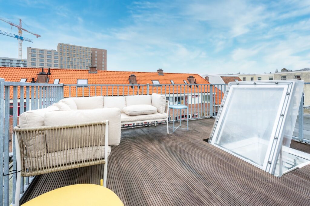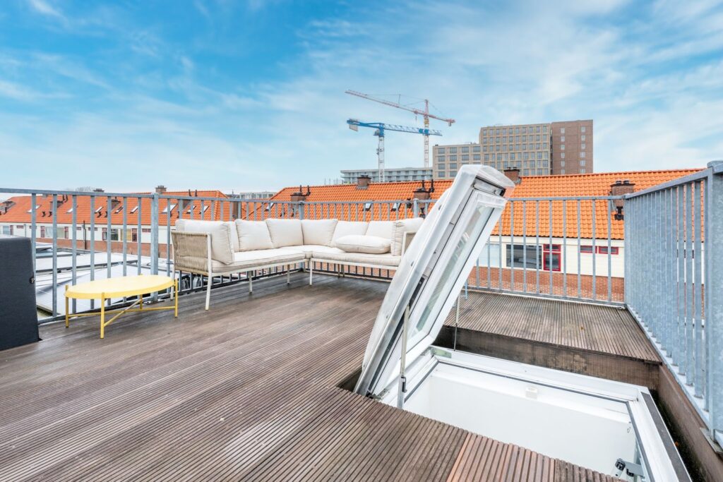 A sturdy loft ladder leads to the spacious rooftop terrace. A wonderful spot with unobstructed views and plenty of space for a lounge set or outdoor dining table. Here you can enjoy the sun in peace—a rare extra in the middle of the city.