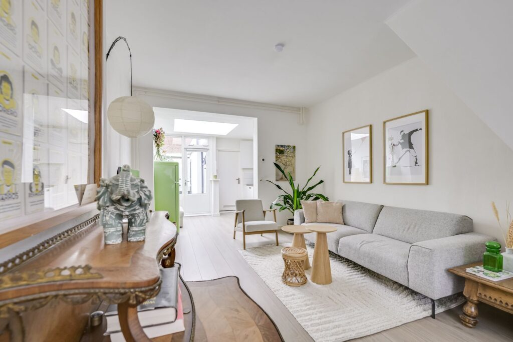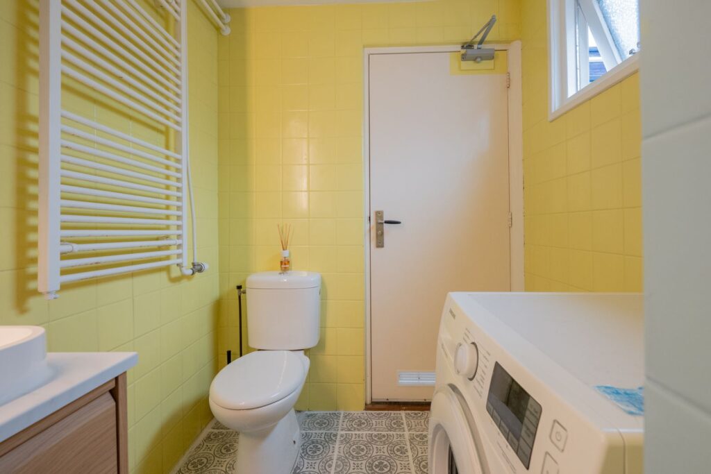 At the rear, you’ll find the kitchen. Thanks to the skylight and the door to the garden, this is a pleasant, bright space. The kitchen is equipped with a gas hob with extractor hood, oven, dishwasher, and plenty of storage. Compact but practically designed—with room for your coffee corner and cooking essentials.