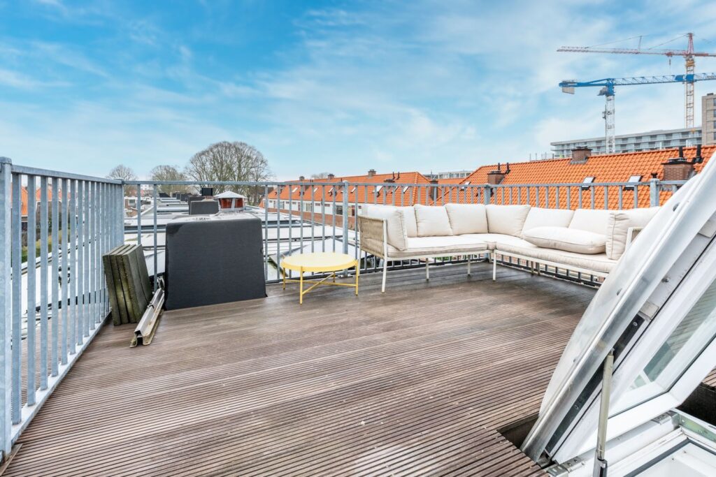 Via een stevige vlizotrap trap bereik je het royale dakterras. Een heerlijke plek met vrij uitzicht en volop ruimte voor een loungeset of buitentafel. Hier geniet je in alle rust van de zon een zeldzame extra midden in de stad.