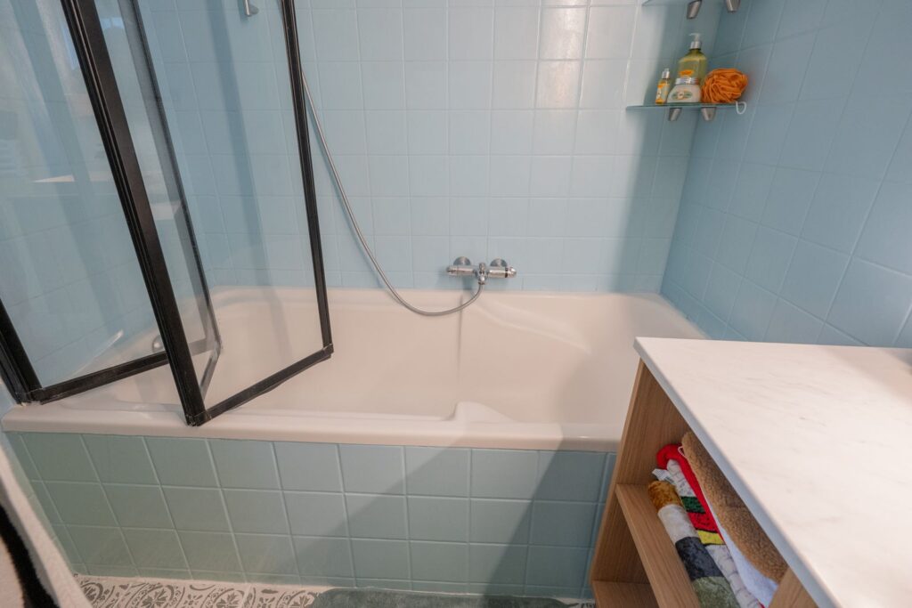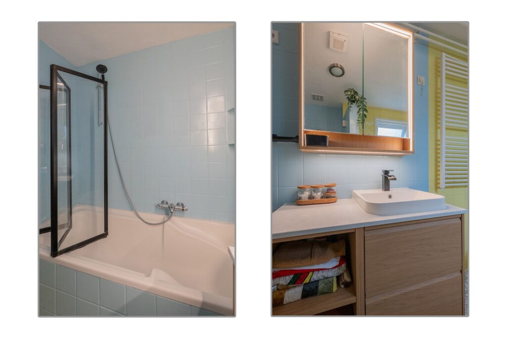 Via de tussenhal bereik je de badkamer. Deze is verrassend compleet en beschikt over een ligbad met douche, modern wastafelmeubel met verlichte spiegelkast, toilet en aansluiting voor de wasmachine.