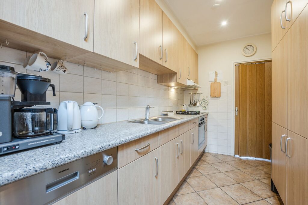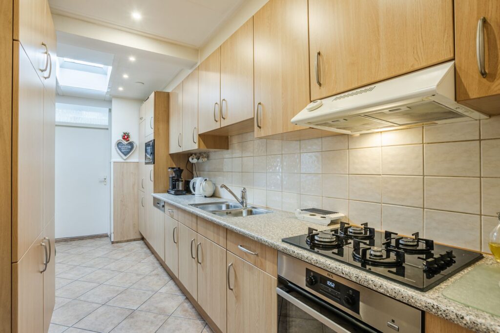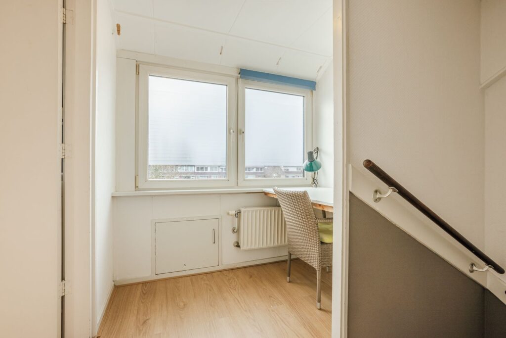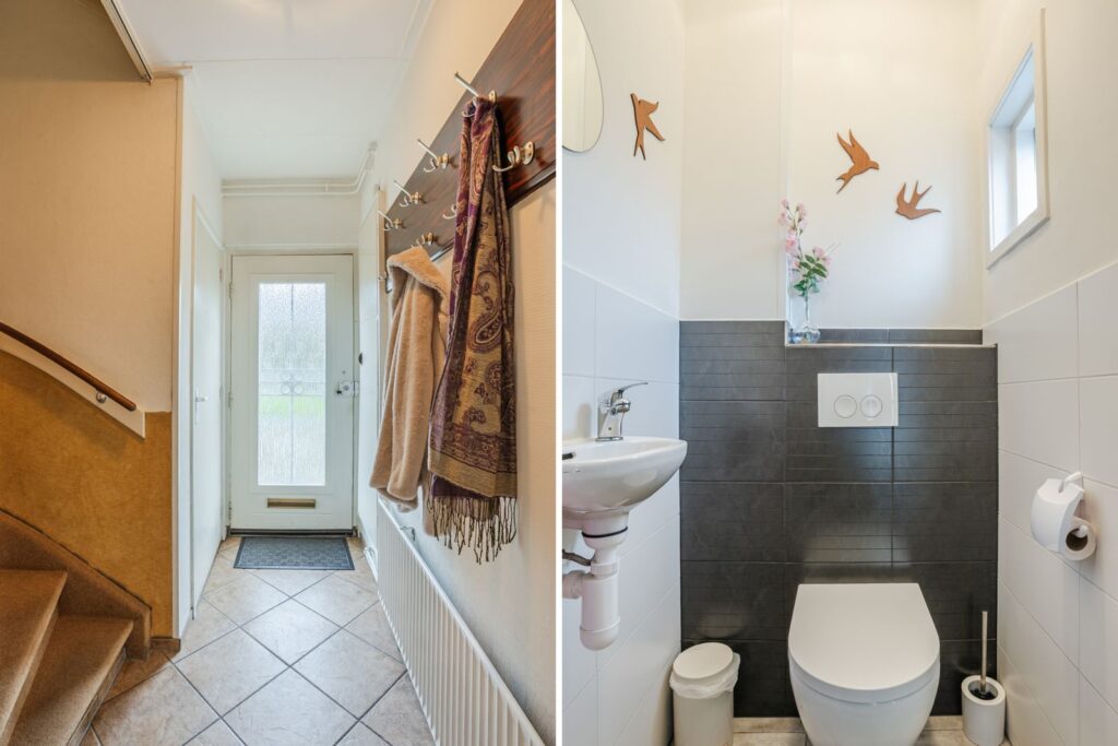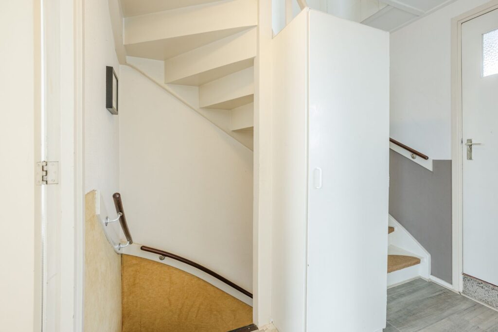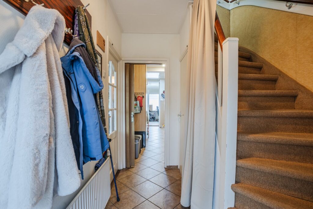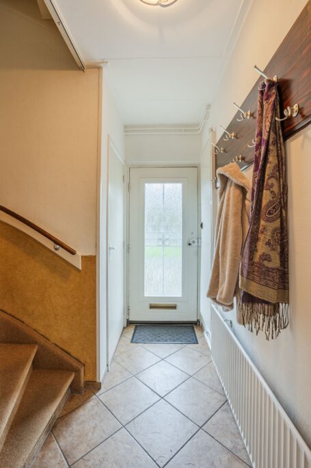 Via de voordeur kom je in de hal. Rechts vind je direct het toilet. Loop je rechtdoor, dan kom je uit bij de ruime keuken. Praktisch is ook de ruime voorraadkast onder de trap. Ga je linksaf, dan stap je de woonkamer in: een fijne, lichte leefruimte met een gashaard voor extra sfeer en warmte.