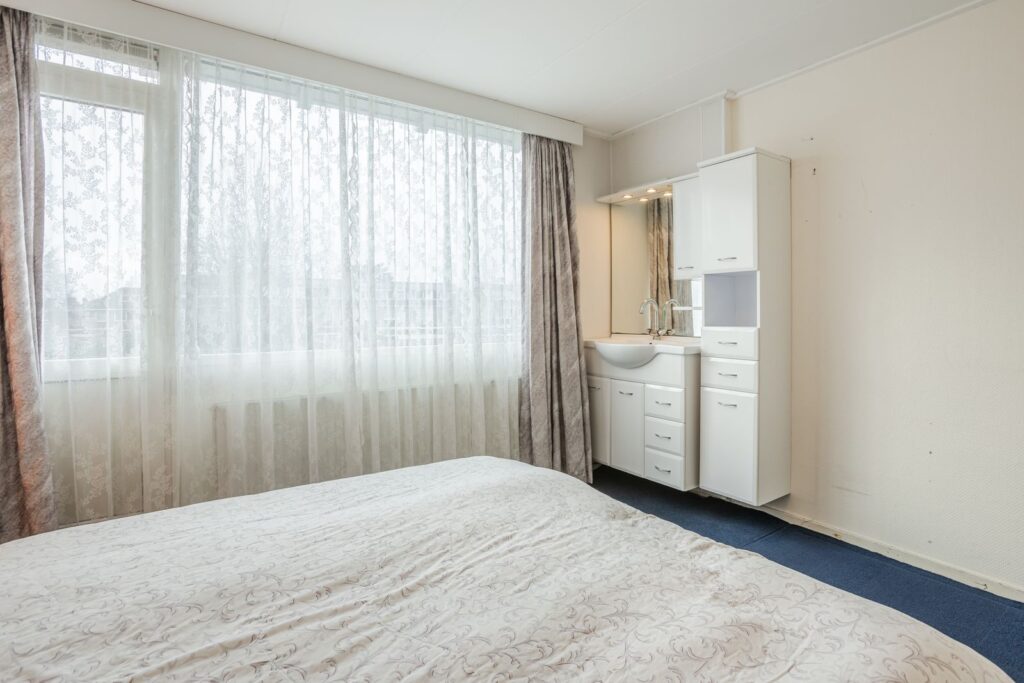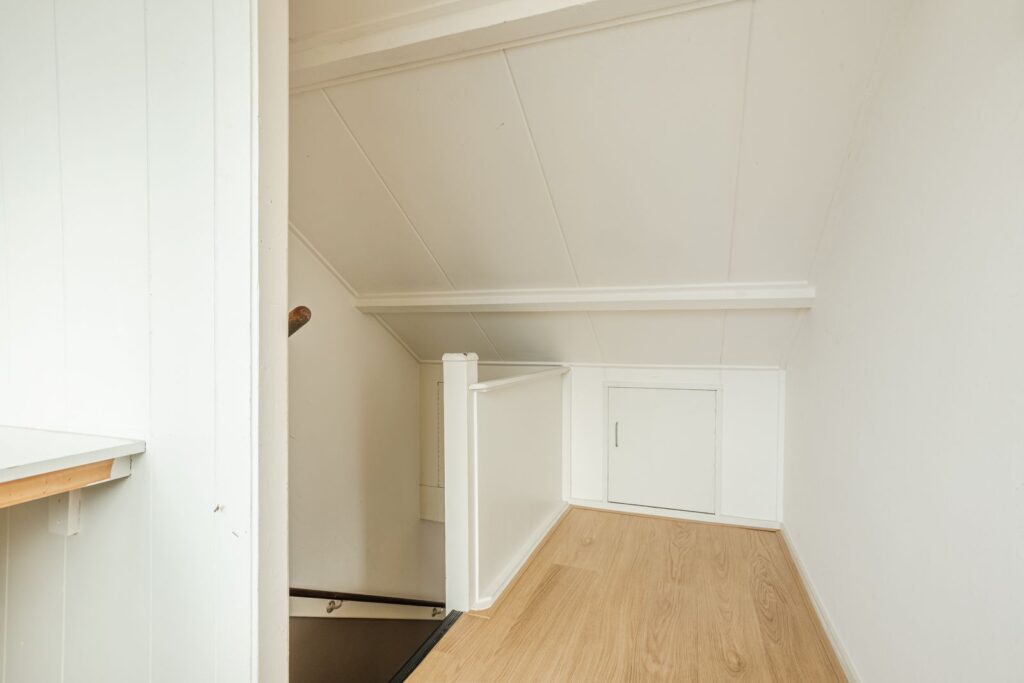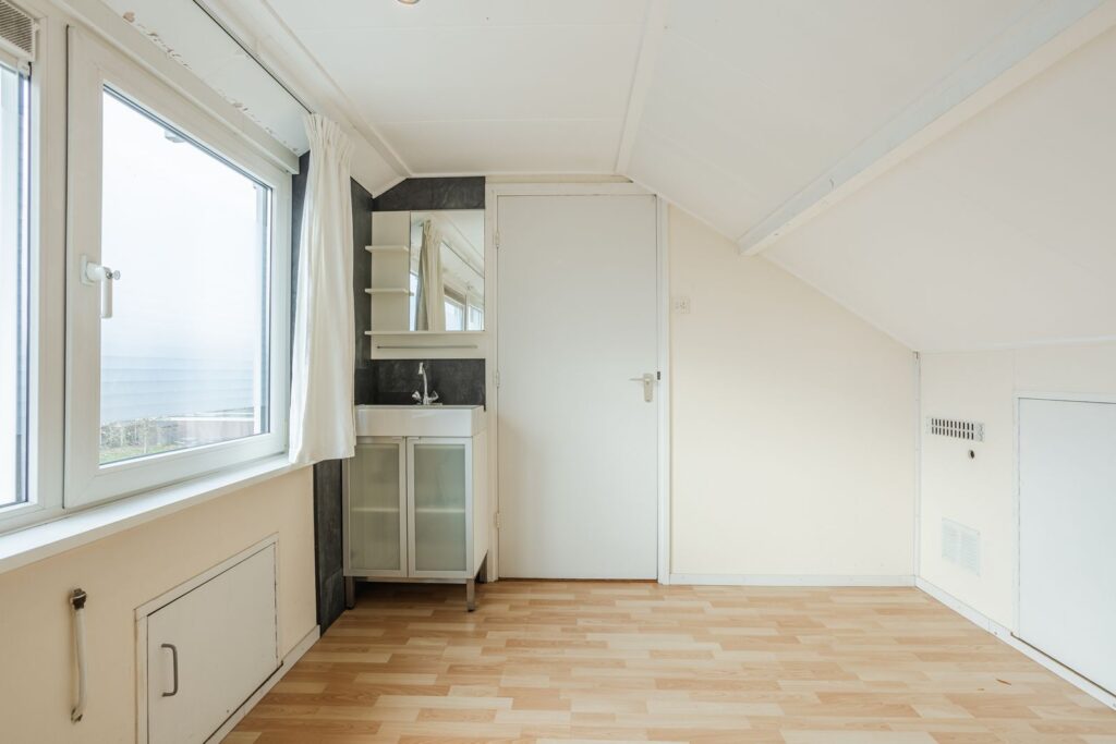 Via een vaste trap bereik je de tweede verdieping. Hier vind je een overloop en een ruime slaapkamer met wastafel. Dankzij de dakopbouw voelt deze verdieping extra ruim aan en is dit een ideale plek voor een master bedroom, tienerkamer of rustige werkruimte.