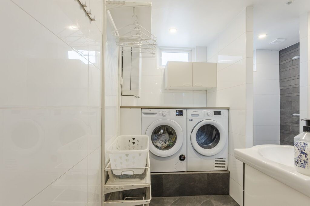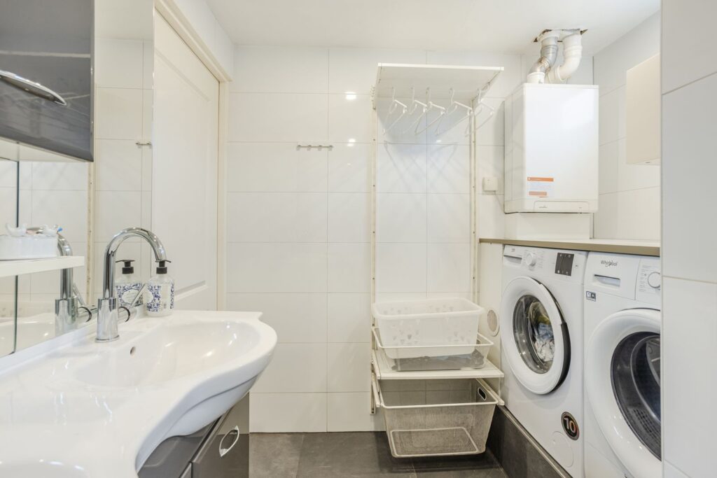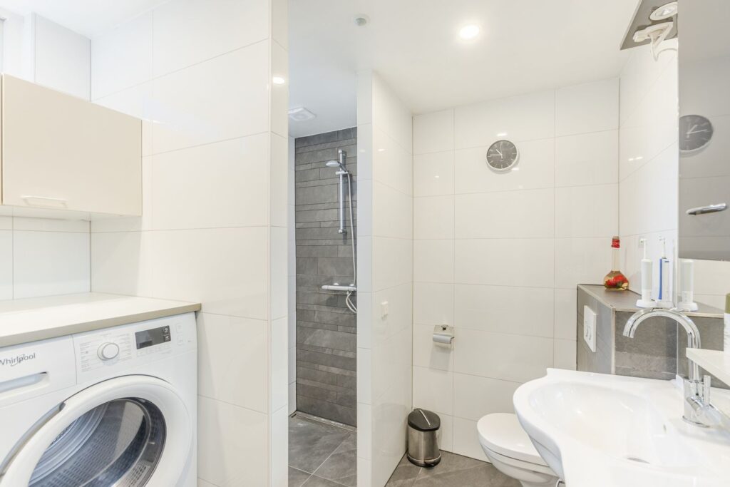 Op de begane grond bevinden zich daarnaast een kantoorruimte (ideaal als werk- of hobbykamer) een slaapkamer met badkamer, waardoor de woning uitstekend geschikt is voor gelijkvloers wonen. Deze slaapkamer en badkamer zijn beide voorzien van vloerverwarming. De badkamer op de begane grond beschikt over de opstelling voor wasmachine en droger.
