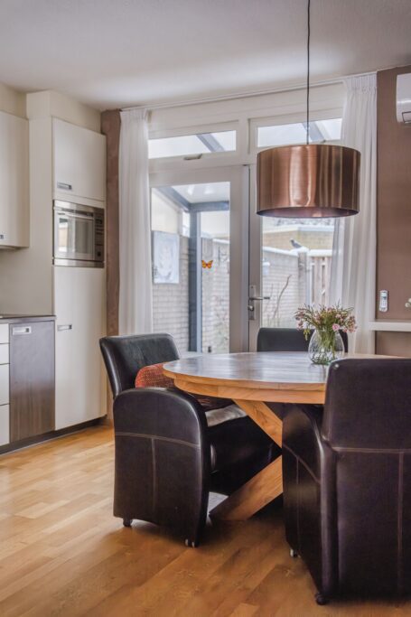 De open keuken is uitgerust met een koelkast, combi-oven/magnetron, vaatwasser en 4-pits gasfornuis. De openslaande tuindeuren zorgen voor een prachtige verbinding met het terras.