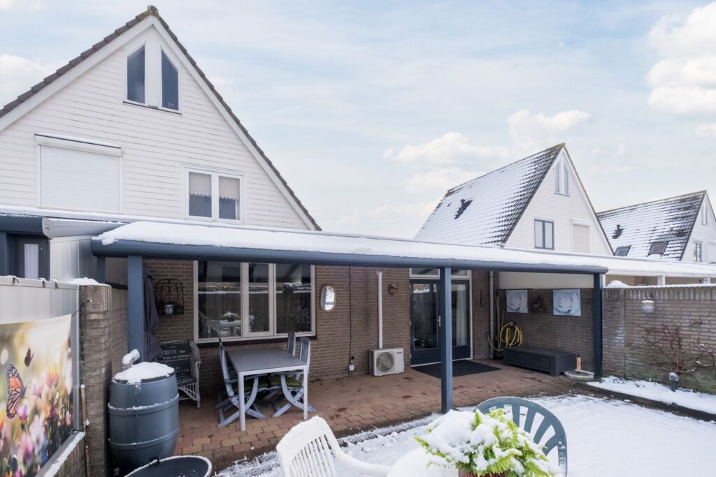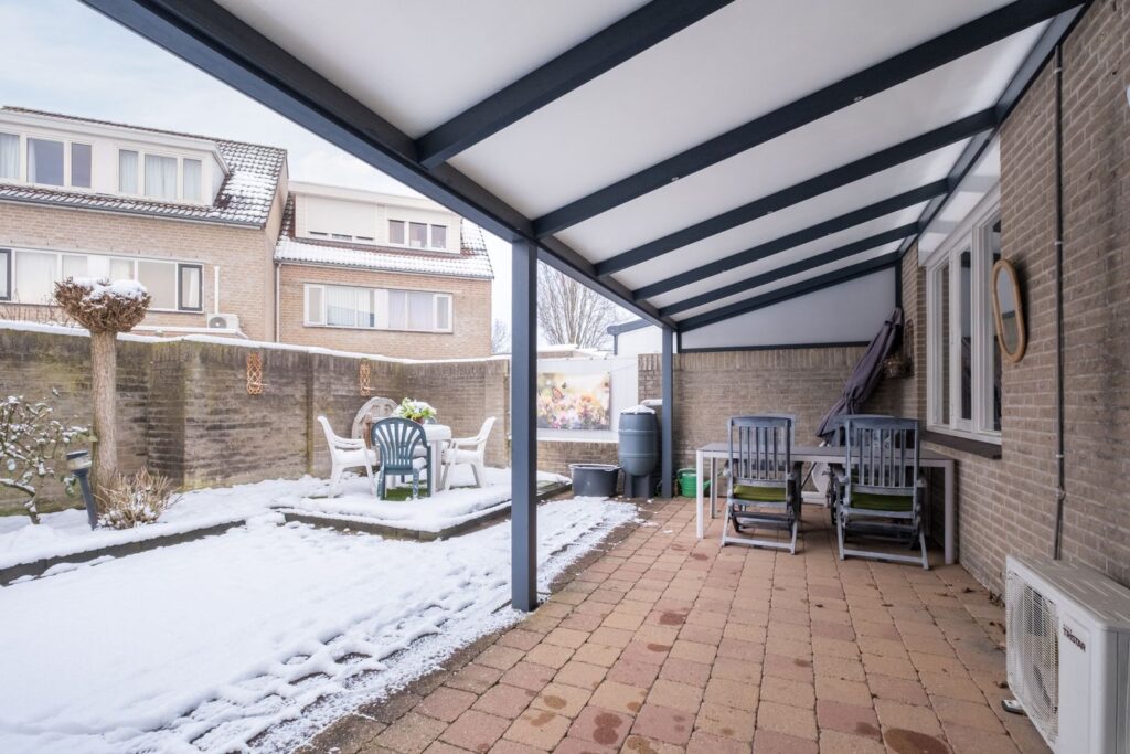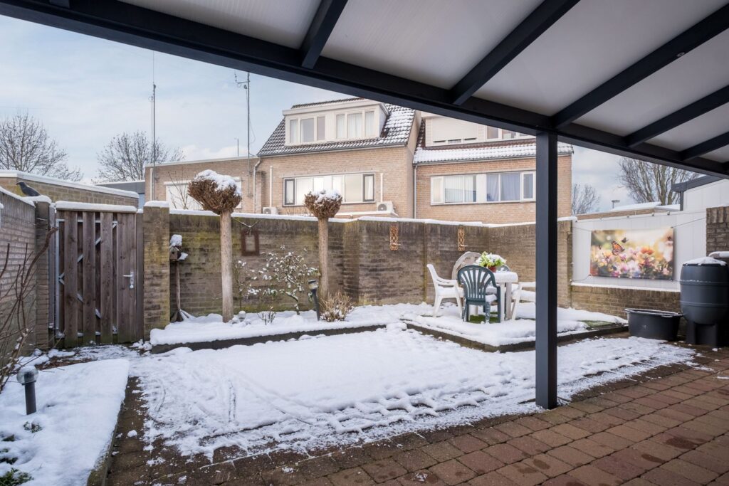 De achtertuin, gelegen op het Westen, is een plek om te genieten. De tuin - 65 m², 5m diep en 8m breed - is onderhoudsarm aangelegd en voorzien van een buitenkraan. Een eyecatcher is de royale overkapping over de volledige breedte van de woning. Dankzij de ingebouwde LED-verlichting kunt u hier tot in de late uurtjes heerlijk buiten zitten. De tuin is via een afsluitbare achterom bereikbaar.