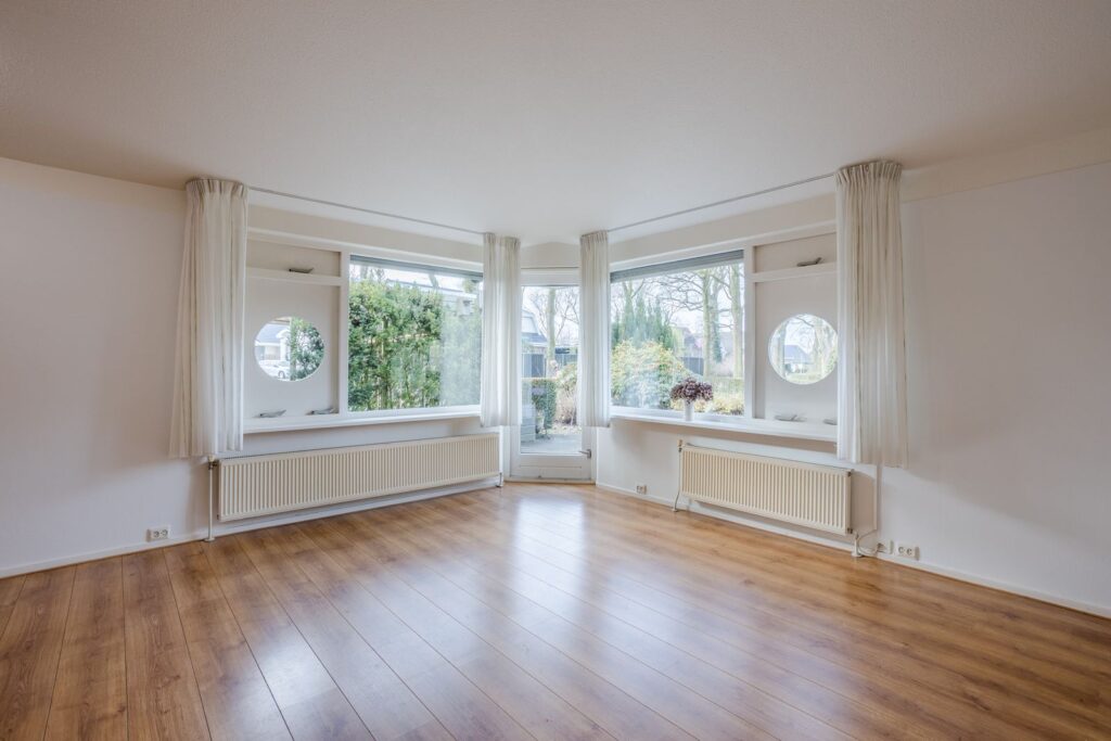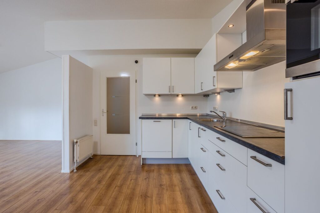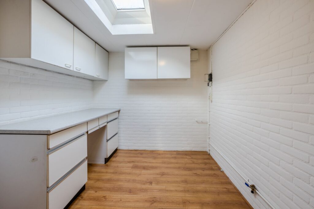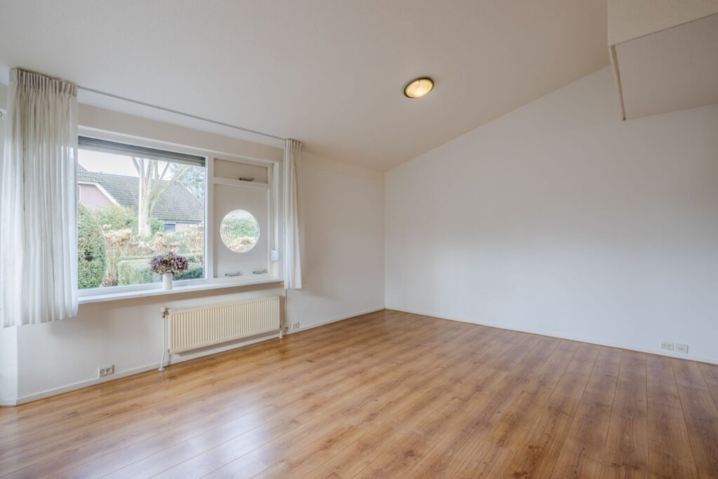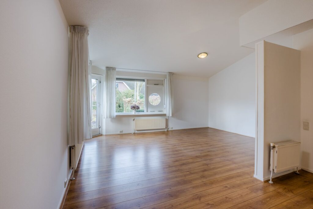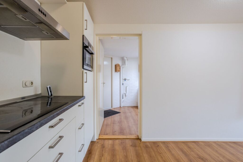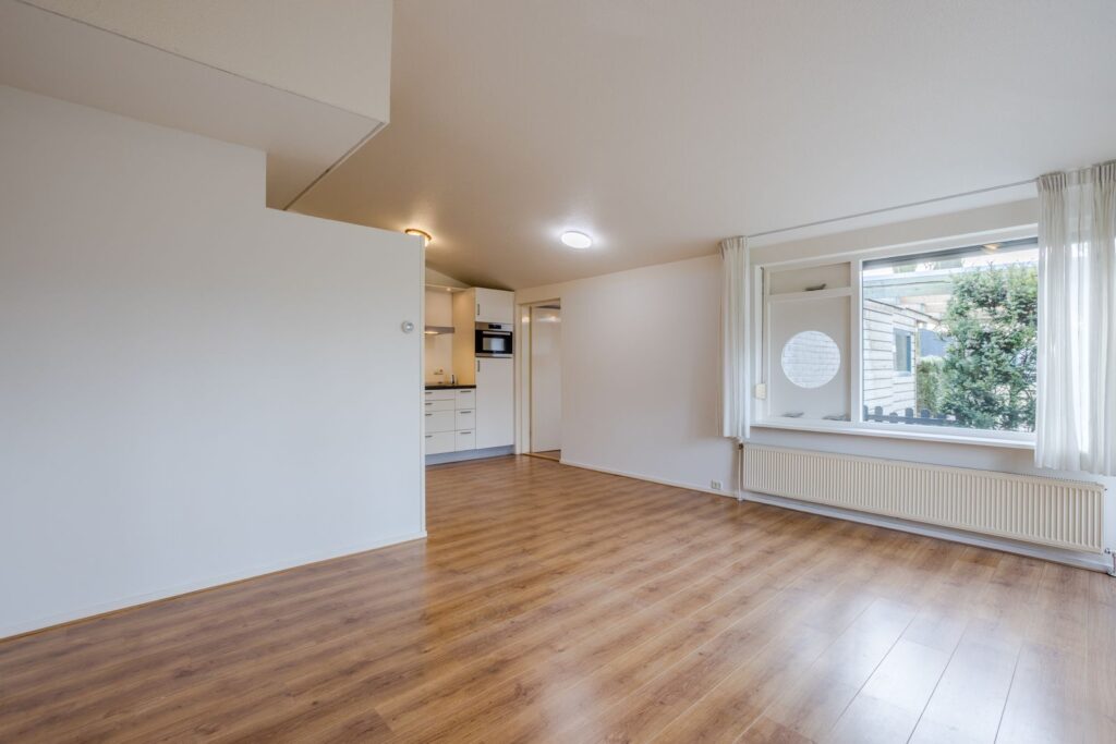 De lichte woonkamer biedt uitzicht op de verzorgde voortuin, gelegen op het zuidwesten. Vanuit de woonkamer is er toegang tot het terras. De begane grond is afgewerkt met een laminaatvloer. De open keuken is voorzien van een inductiekookplaat, combimagnetron (2022), inbouwvaatwasser (2023) en koelkast.