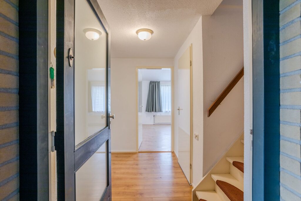 Entree/hal met vaste kast en vernieuwde toiletruimte (2022). Badkamer met inloop regen-/massagedouche en wastafelmeubel (2022). Slaapkamer aan de voorzijde. Lichte woonkamer met toegang tot het terras. Open keuken. Bijkeuken.