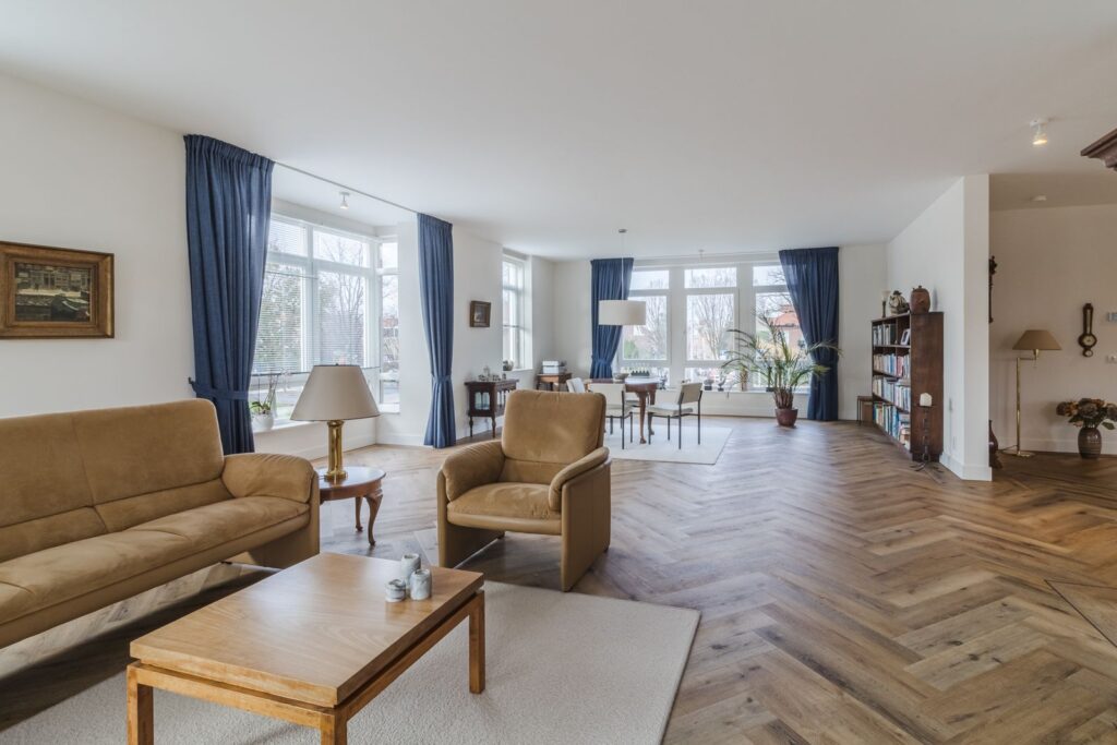 Het appartement is gelegen op de gehele eerste verdieping van het appartementencomplex waarbij u vanuit de lift direct uw woning binnen stapt. De living is meer dan riant te noemen en is in de huidige situatie ingedeeld in een woonkamer van ca 57m2, een eetkamer van ca 37m2 en een keuken van 17m2. Indien gewenst kan de living verder opgesplitst worden en kunnen extra kamers gerealiseerd worden.