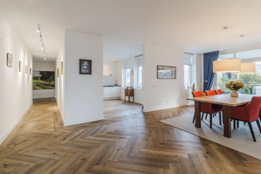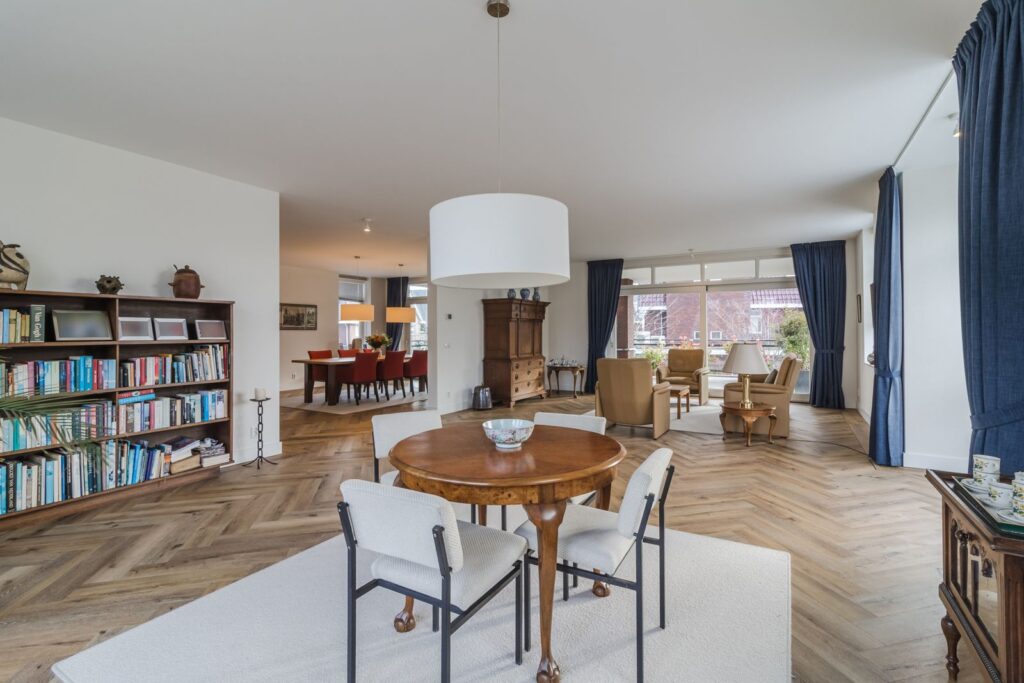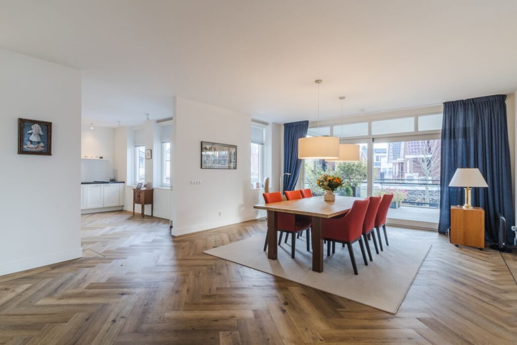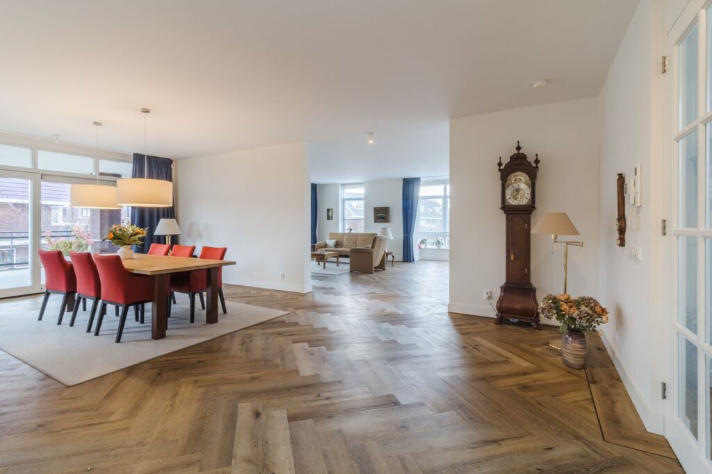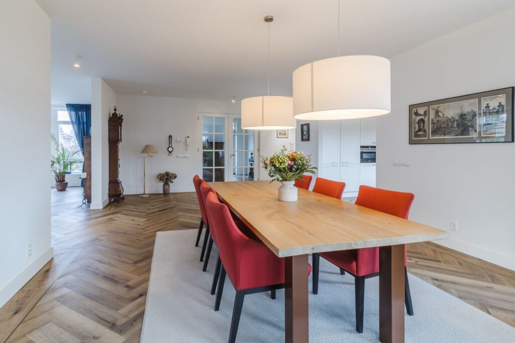 Zowel woonkamer als eetkamer hebben een schuifpui naar het overdekte balkon van 56 m2, waar u heerlijk beschut zit. De ruimten lopen zonder deuren , maar wel deels afgescheiden in elkaar over.