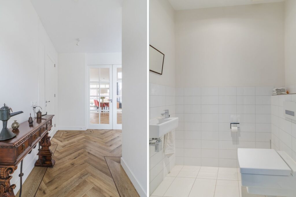 Via een mooi verlichte gang bereikt u een tweede hal met deuren naar de twee slaapkamers , badkamer en aparte wasruimte met aansluiting voor wasmachine.