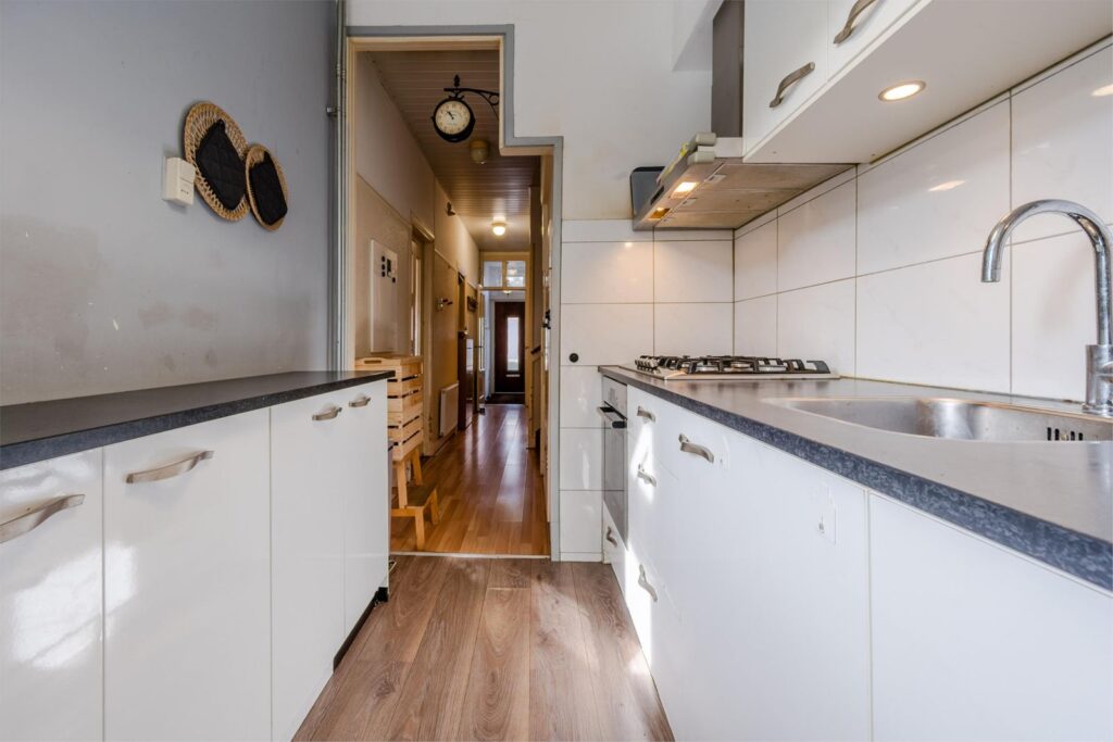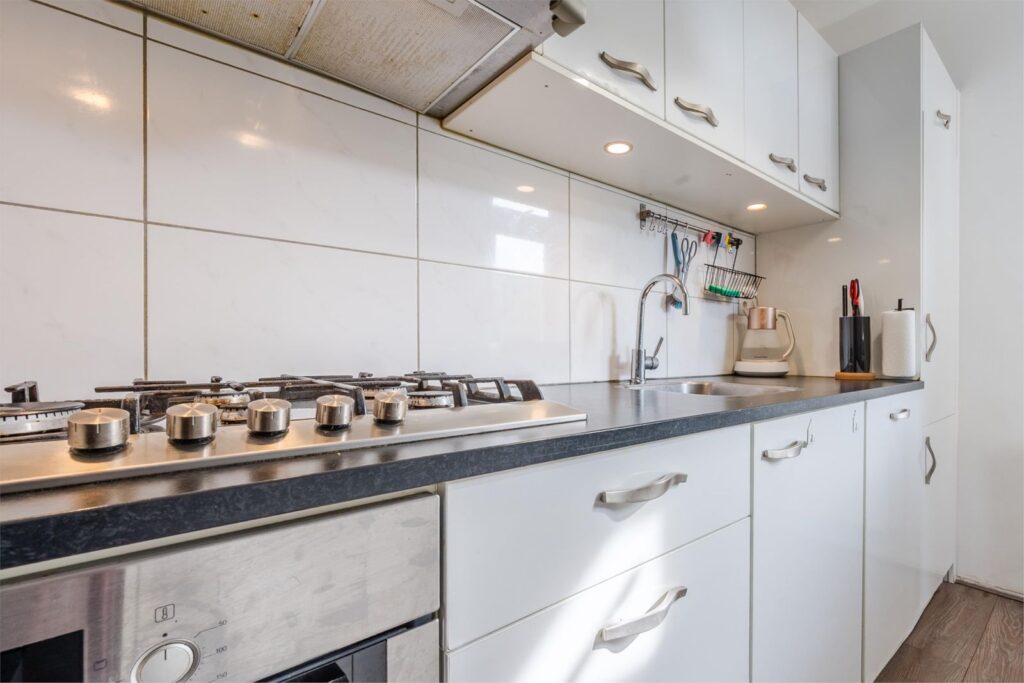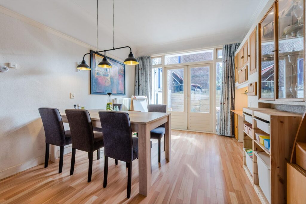 Aan de achterzijde treft u de eetkamer, die grenst aan de openslaande deuren naar het terras en de kleine tuin. De moderne keuken is voorzien van witte keukenkasten met koperkleurige accenten en is uitgerust met diverse BOSCH inbouwapparatuur, waaronder een oven, gaskookplaat, afzuigkap en koelkast. Een deur geeft u direct toegang tot het terras en zorgt voor extra daglicht tijdens het koken.