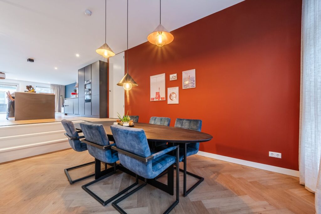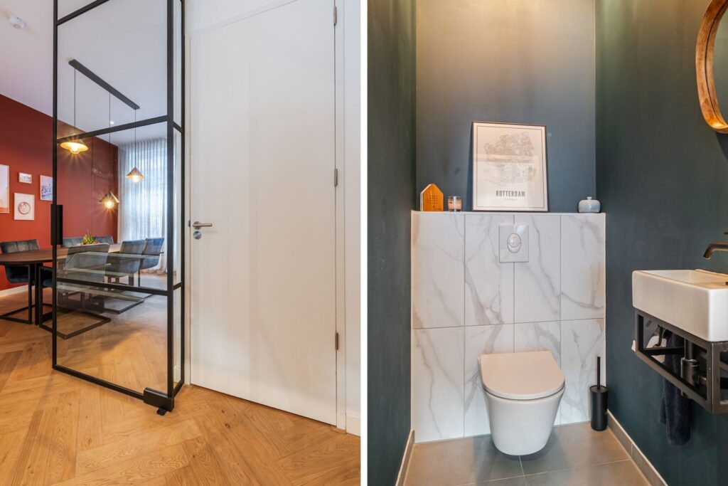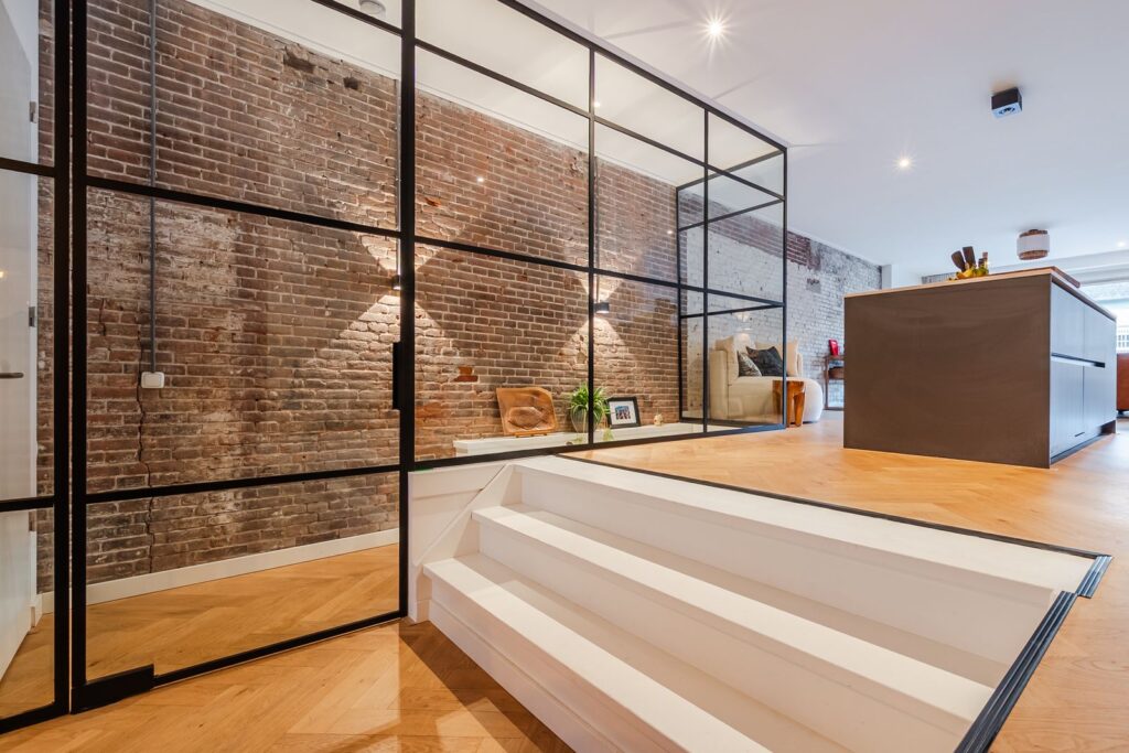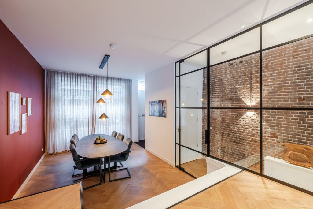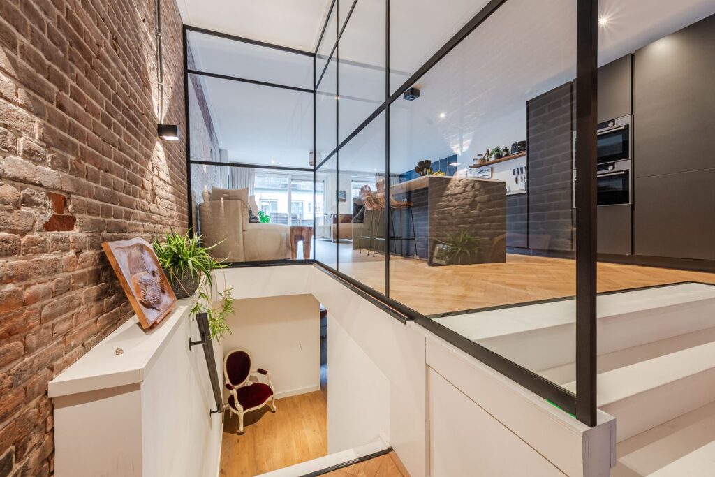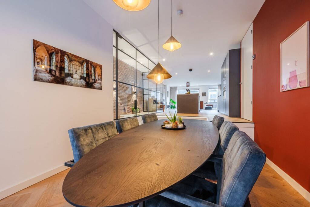 Via de entree betreed je de eetkamer. De pui met openslaande deuren verwijst nog naar de vroegere bedrijvigheid; het pand deed in het verleden dienst als winkel. De glazen pui met deur en stijlvol aluminium frame scheidt de overloop met toilet en de trap naar het souterrain, terwijl de stoere originele stenen wand volledig zichtbaar blijft.