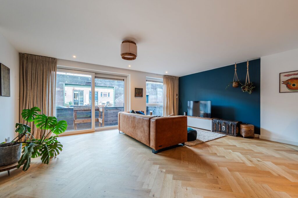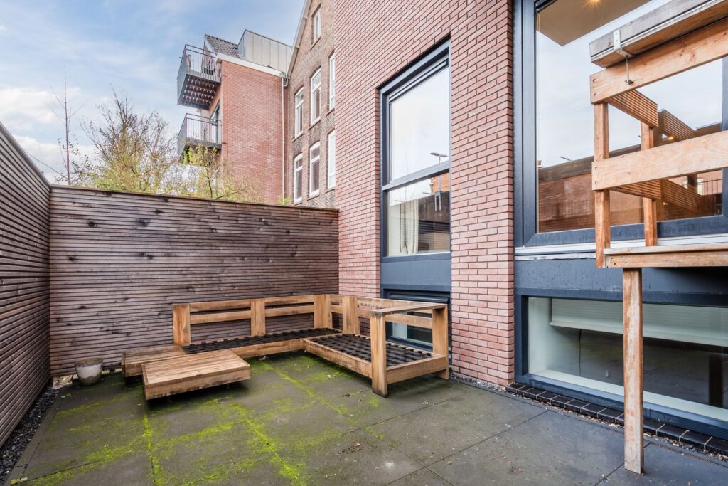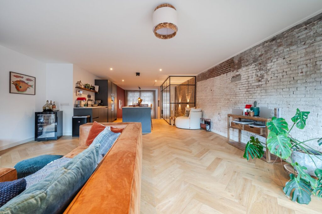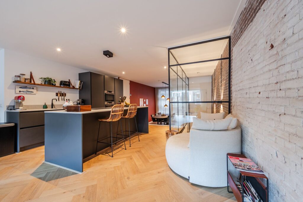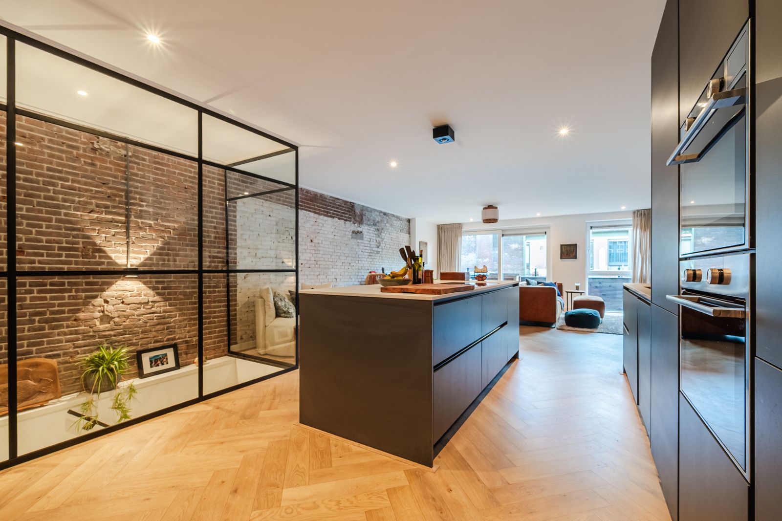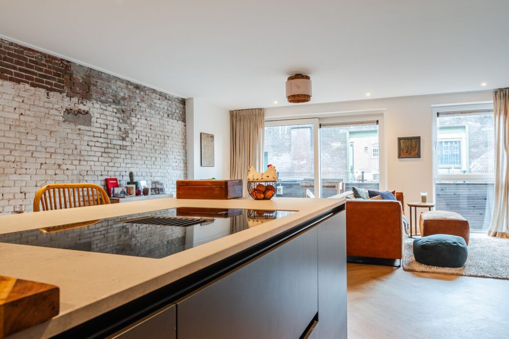 De living en keuken liggen iets hoger, wat zorgt voor een speels effect. De exclusieve keuken is zeer compleet uitgevoerd en beschikt onder andere over een stoomoven, combi-oven en Quooker. Het kookeiland is voorzien van een inductiekookplaat met geïntegreerde afzuiging en biedt de mogelijkheid om gezellig aan de bar aan te schuiven. Op deze verdieping ligt een eikenhouten visgraatparketvloer. De brede raampartij met schuifpui zorgt voor veel lichtinval en biedt toegang tot de lager gelegen tuin. Hier kun je beschut buiten zitten met uitzicht op de voormalige gevangenis, die inmiddels volledig is gerenoveerd tot een luxe appartementencomplex.