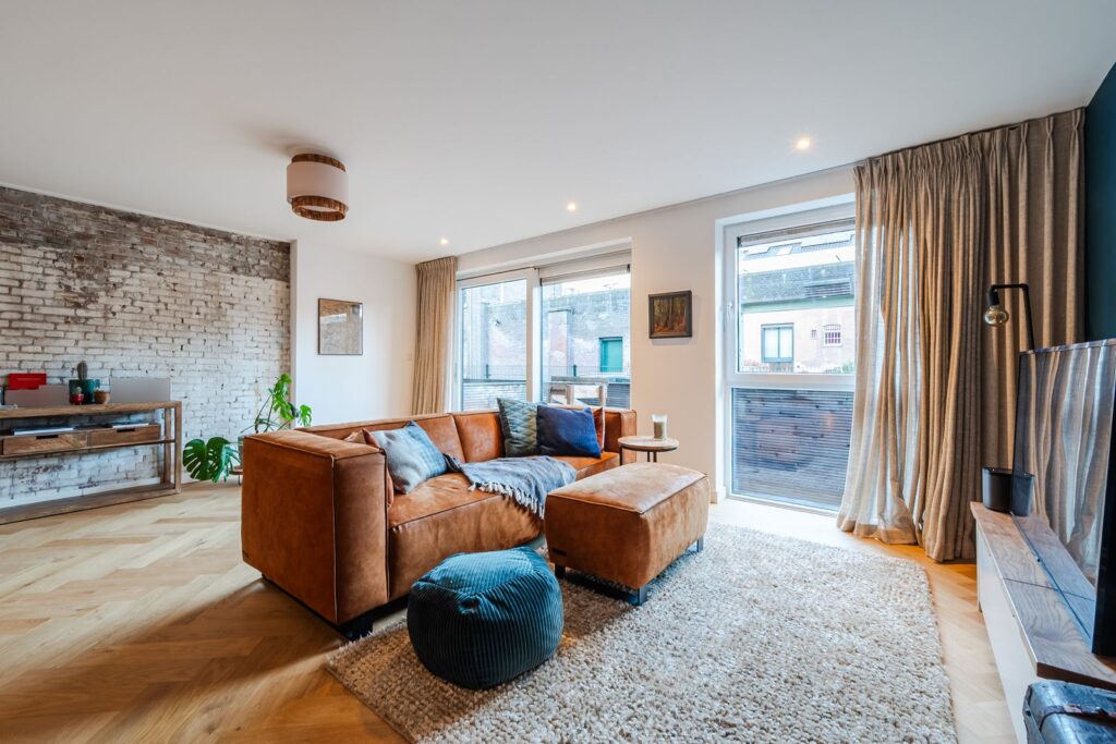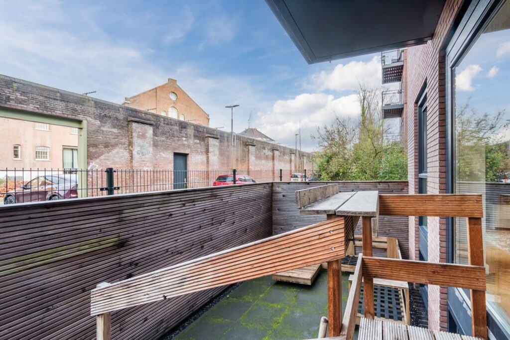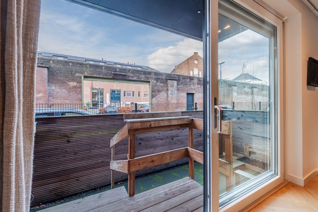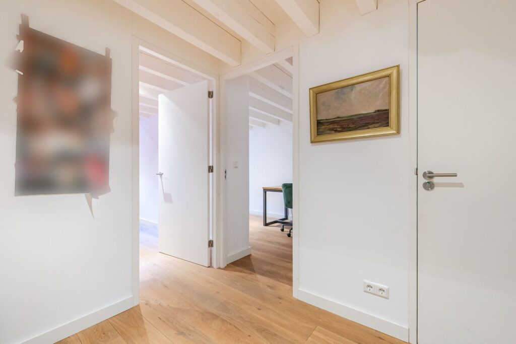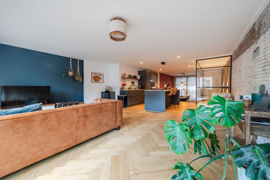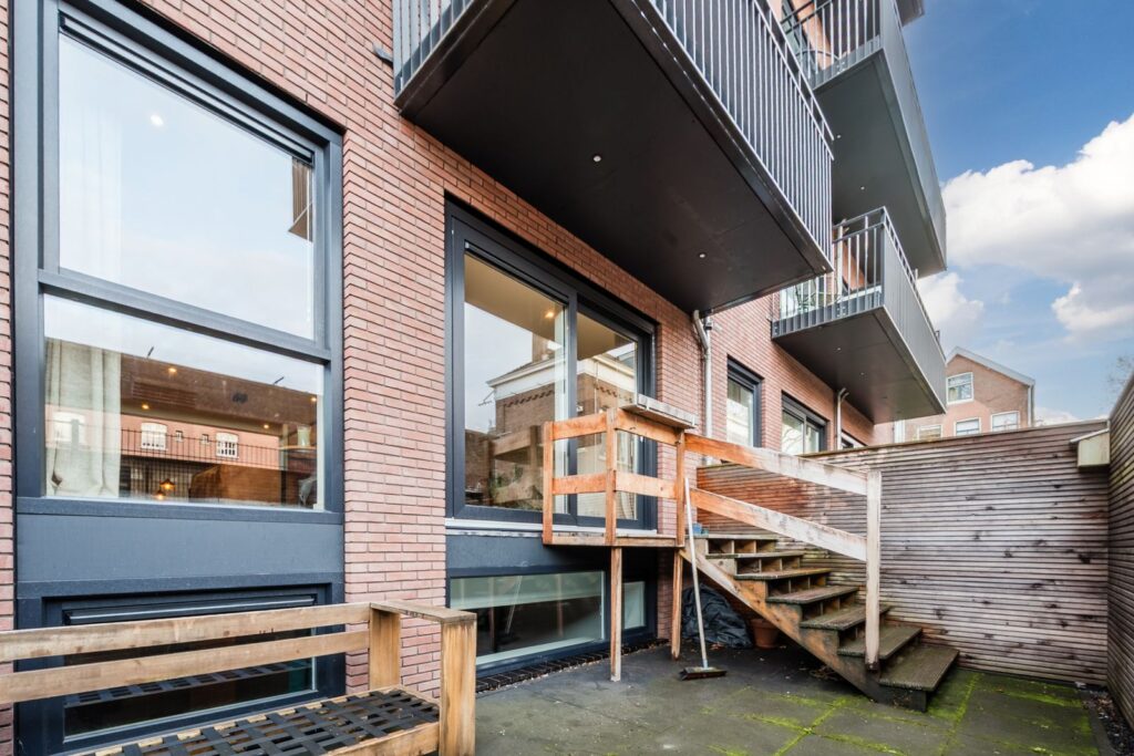 De living en keuken liggen iets hoger, wat zorgt voor een speels effect. De exclusieve keuken is zeer compleet uitgevoerd en beschikt onder andere over een stoomoven, combi-oven en Quooker. Het kookeiland is voorzien van een inductiekookplaat met geïntegreerde afzuiging en biedt de mogelijkheid om gezellig aan de bar aan te schuiven. Op deze verdieping ligt een eikenhouten visgraatparketvloer. De brede raampartij met schuifpui zorgt voor veel lichtinval en biedt toegang tot de lager gelegen tuin. Hier kun je beschut buiten zitten met uitzicht op de voormalige gevangenis, die inmiddels volledig is gerenoveerd tot een luxe appartementencomplex.