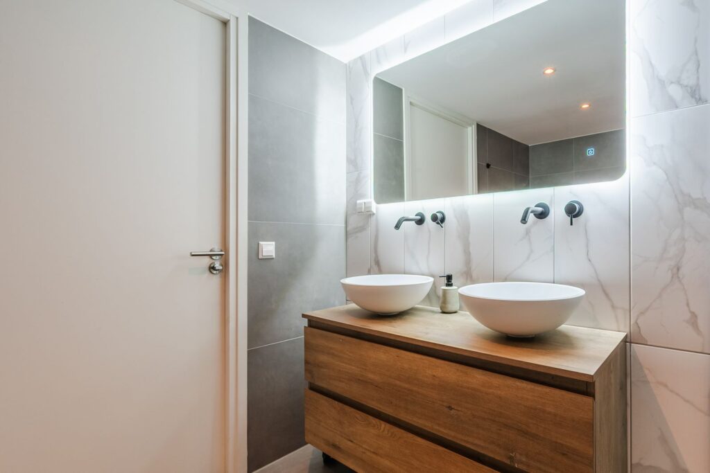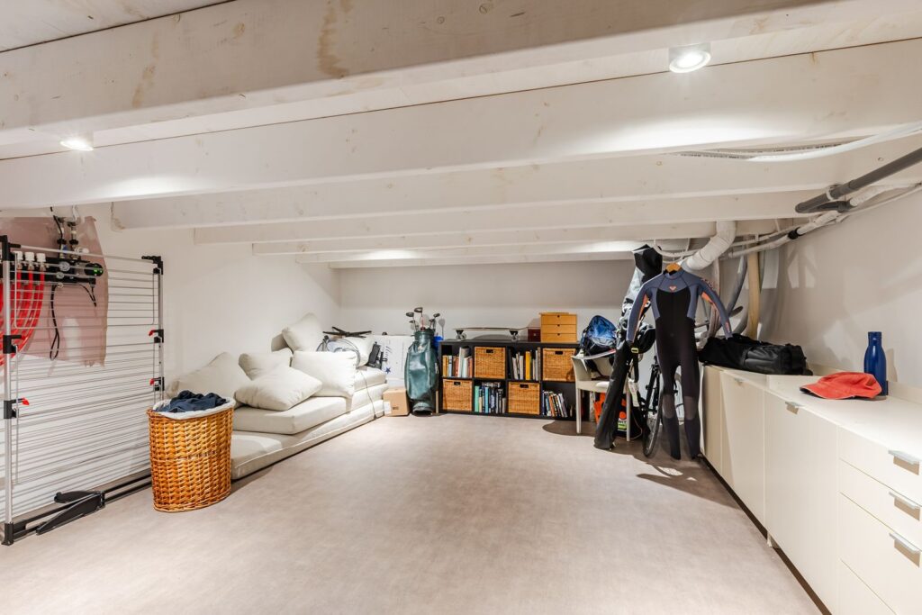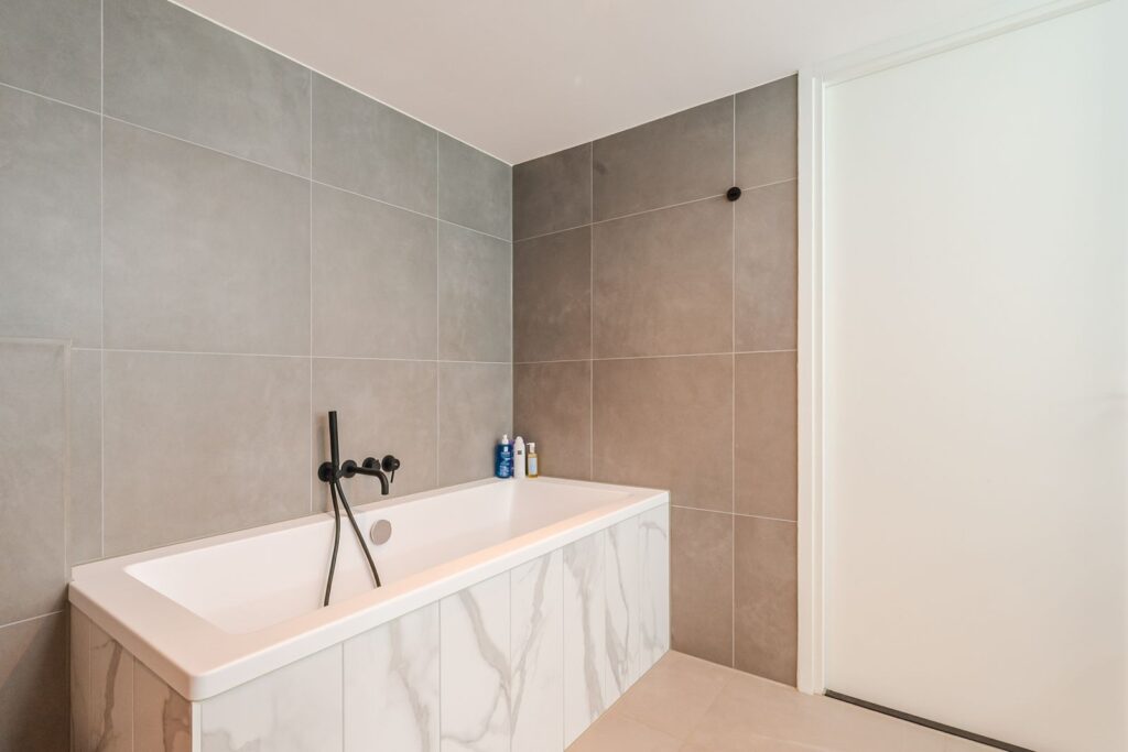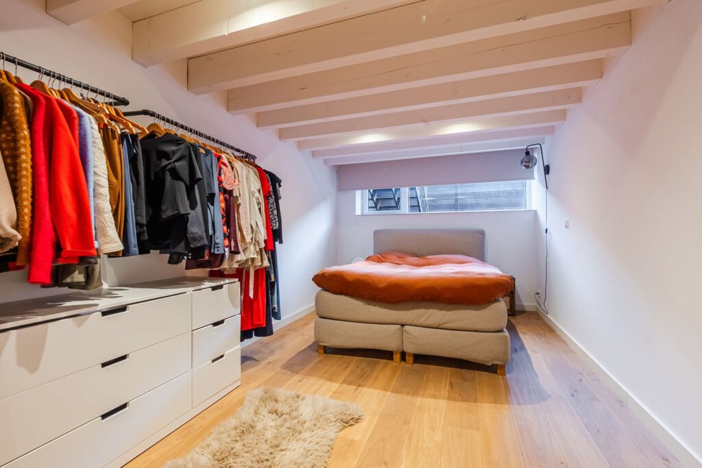 De twee slaapkamers bevinden zich aan de achterzijde en bieden zicht op de tuin. De ruime inpandige berging van circa 22 m² biedt naast opslagruimte volop mogelijkheden. De luxe badkamer, volledig gerenoveerd in 2022, is voorzien van een riante inloopdouche, een ligbad, een toilet en een wastafelmeubel met dubbele waskommen. Ook in het souterrain ligt een houten vloer met vloerverwarming.