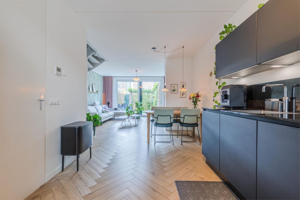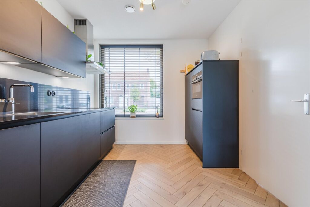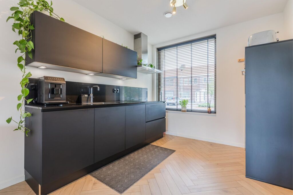 Alles is strak afgewerkt en klaar voor jarenlang woonplezier. De keuken heeft een moderne, luxe uitstraling en is uitgerust met hoogwaardige inbouwapparatuur waaronder een inductiekookplaat, vaatwasser, ruime koelkast en een Quooker. Dankzij het grote raam valt het daglicht royaal naar binnen en heb je zicht op je groene voortuintje.