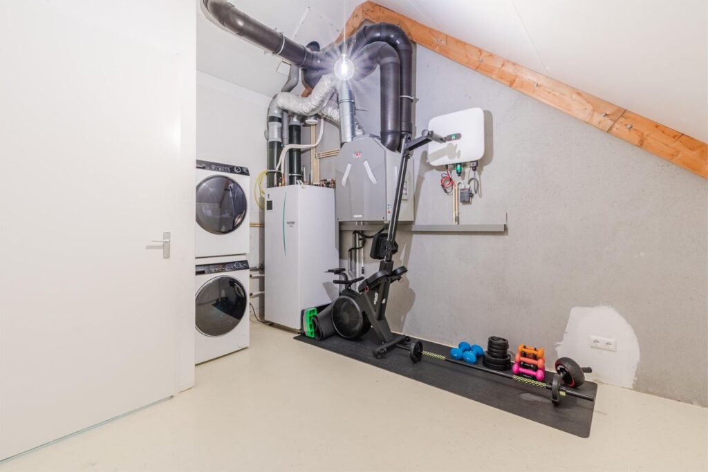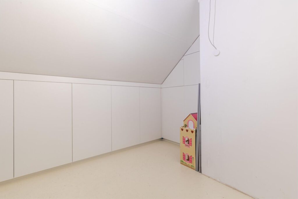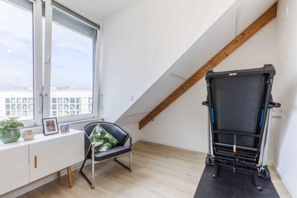 De tweede verdieping biedt nog extra ruimte met een derde (slaap)kamer (9,67m²) die dankzij de ruime dakkapel veel licht binnenlaat. Deze ruimte wordt momenteel als sport/werkkamer gebruikt, maar kan bijvoorbeeld ook dienen als derde slaapkamer. Daarnaast bevindt zich hier een zolderverdieping met een hoge nok en slimme, ruime op maat gemaakte opbergkasten. Deze ruimte is ideaal als opbergplek, sportruimte of om naar eigen wens verder in te richten, flexibel en klaar voor verschillende woonwensen.
